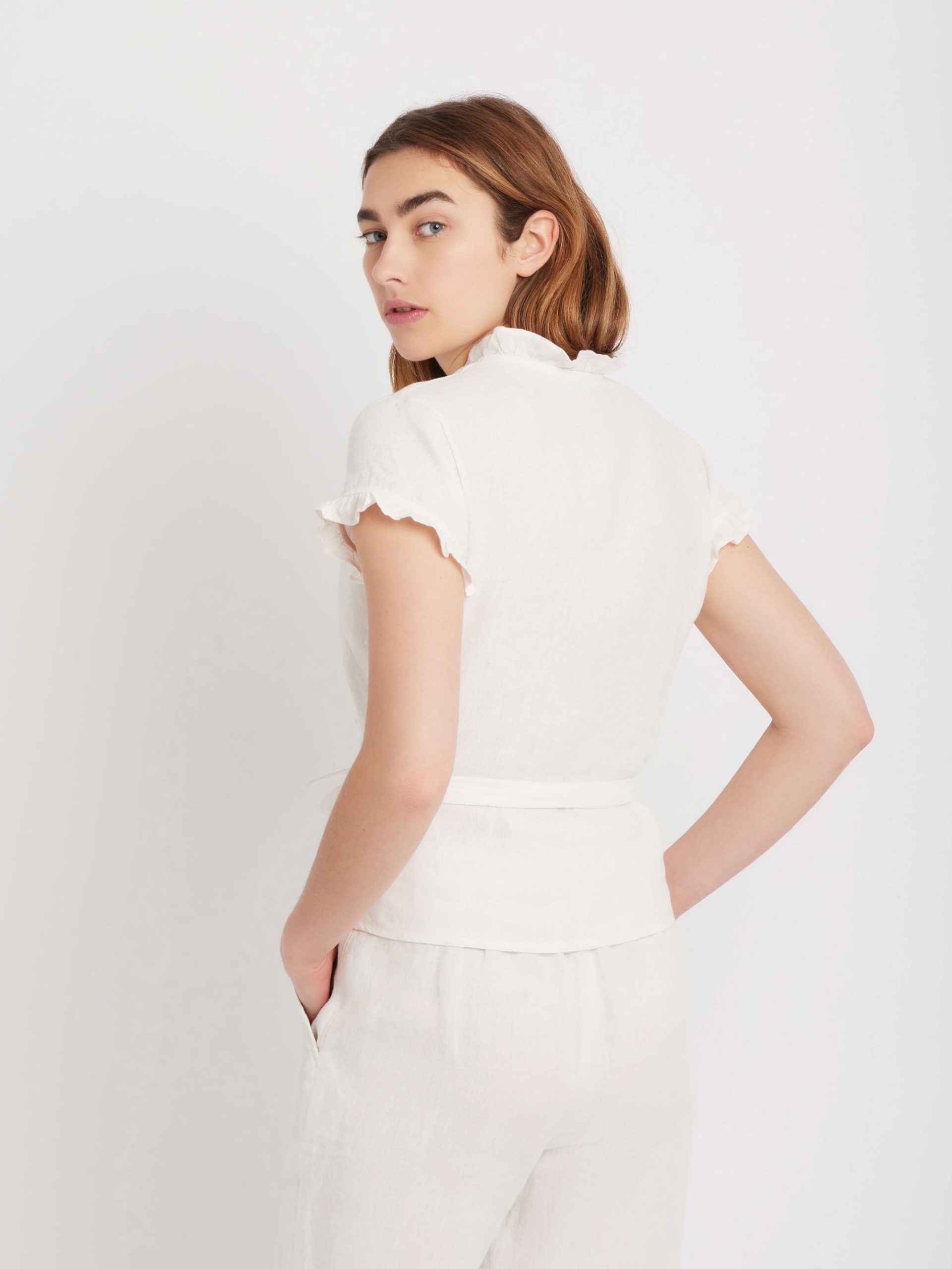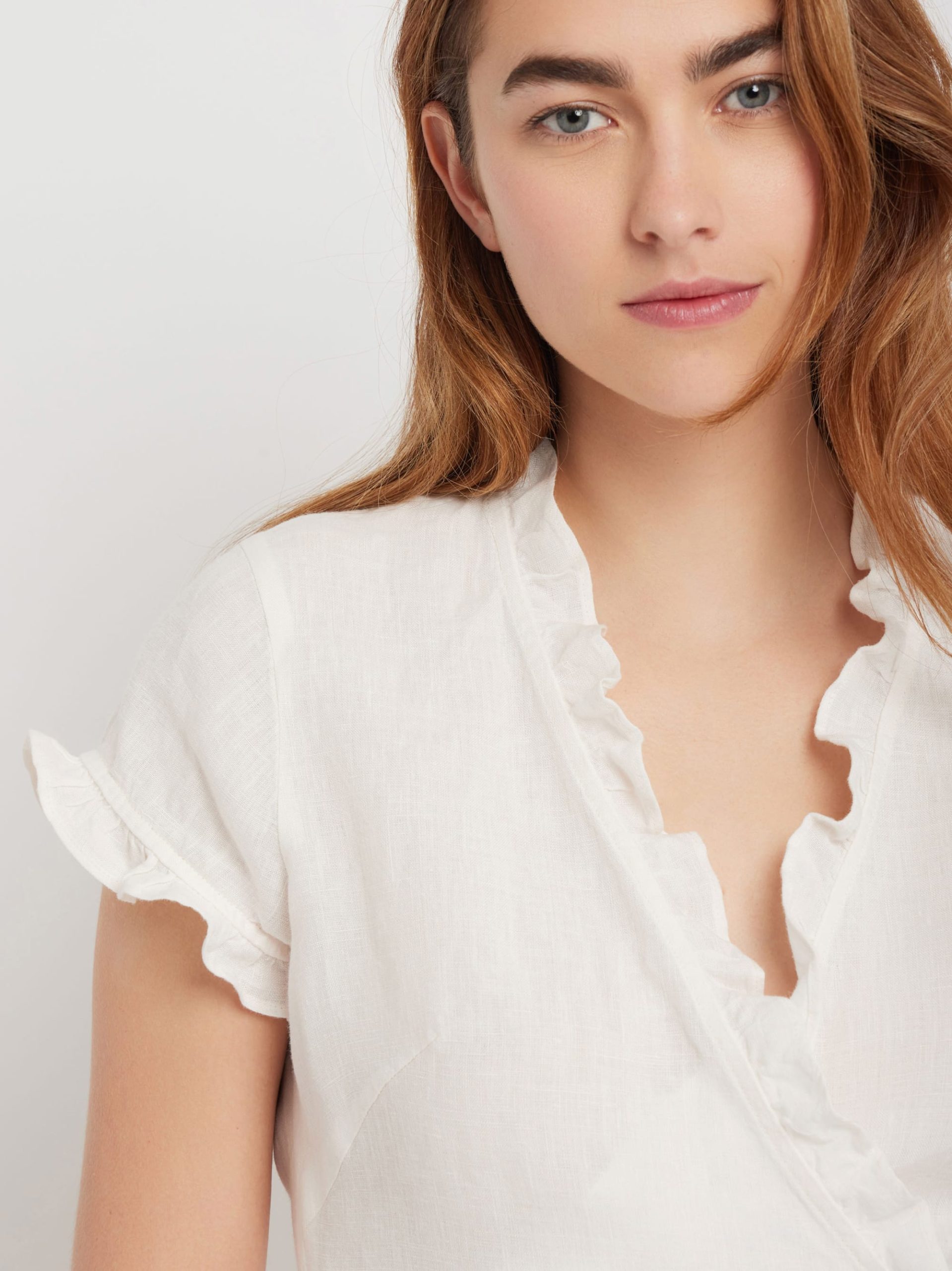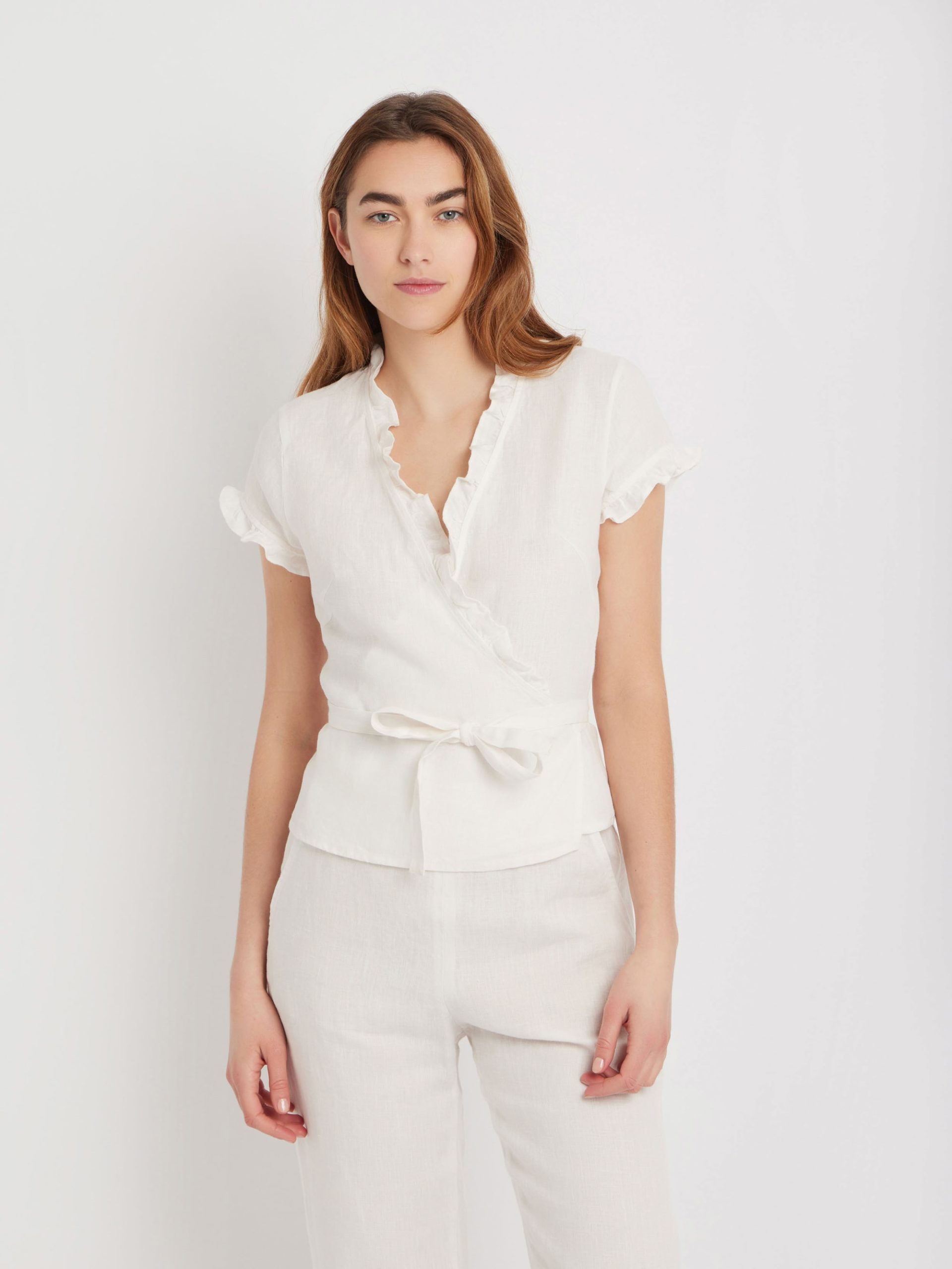 This ruffled wrap shirt is made of pure linen, a light breathable fabric, ideal for summer. This fabric is woven and dyed in Belgium, with Masters of Linen® certification.