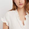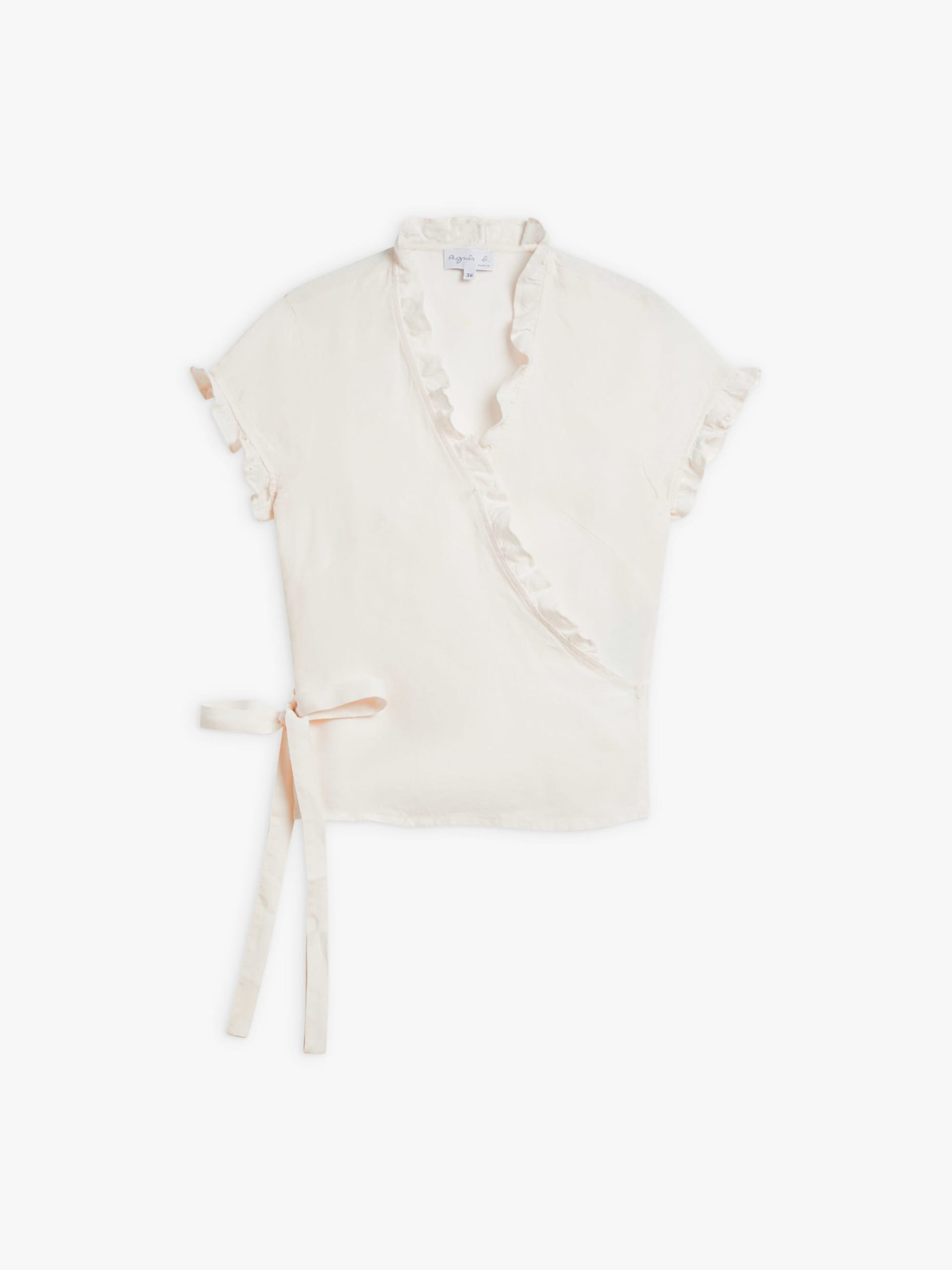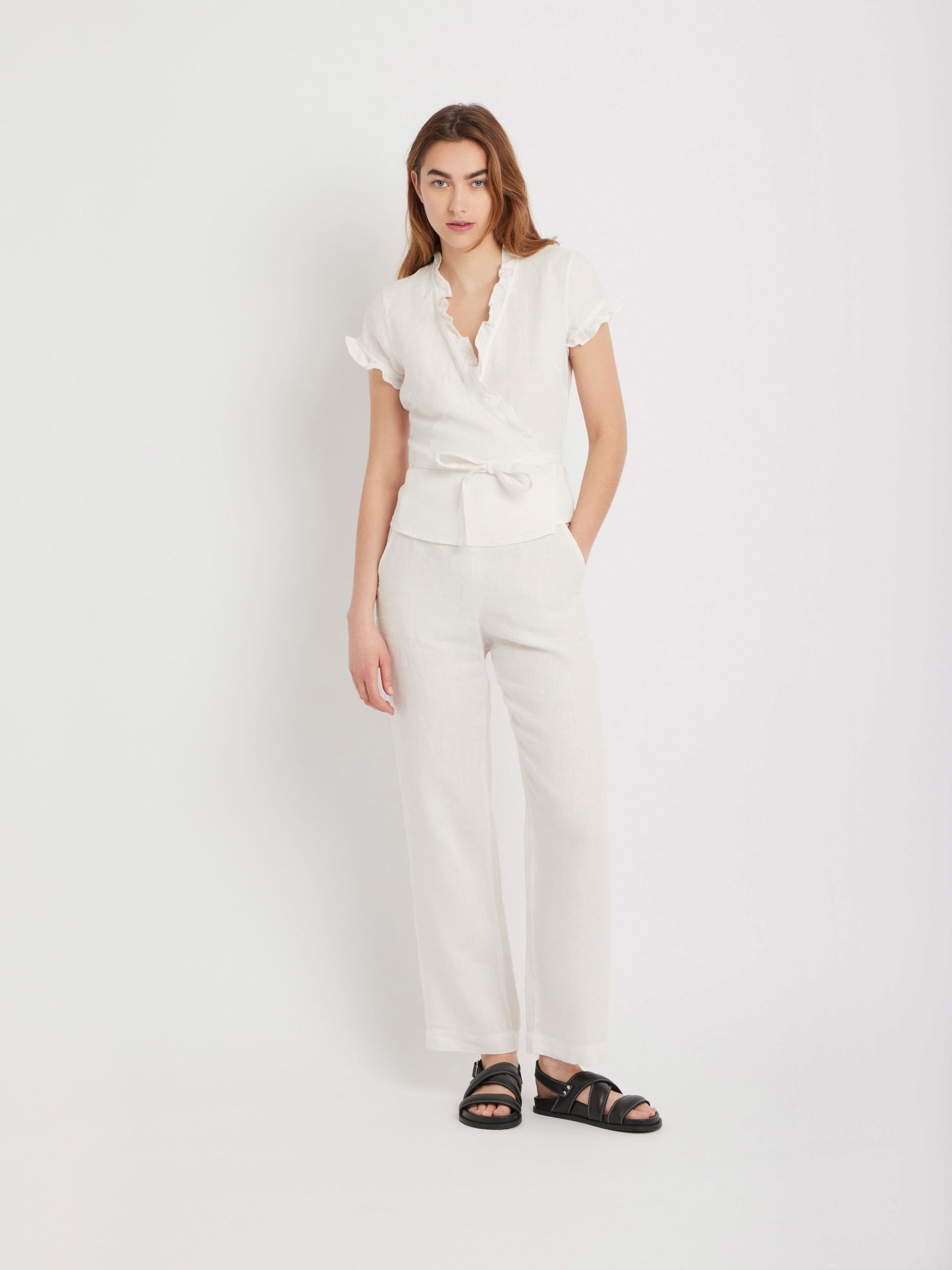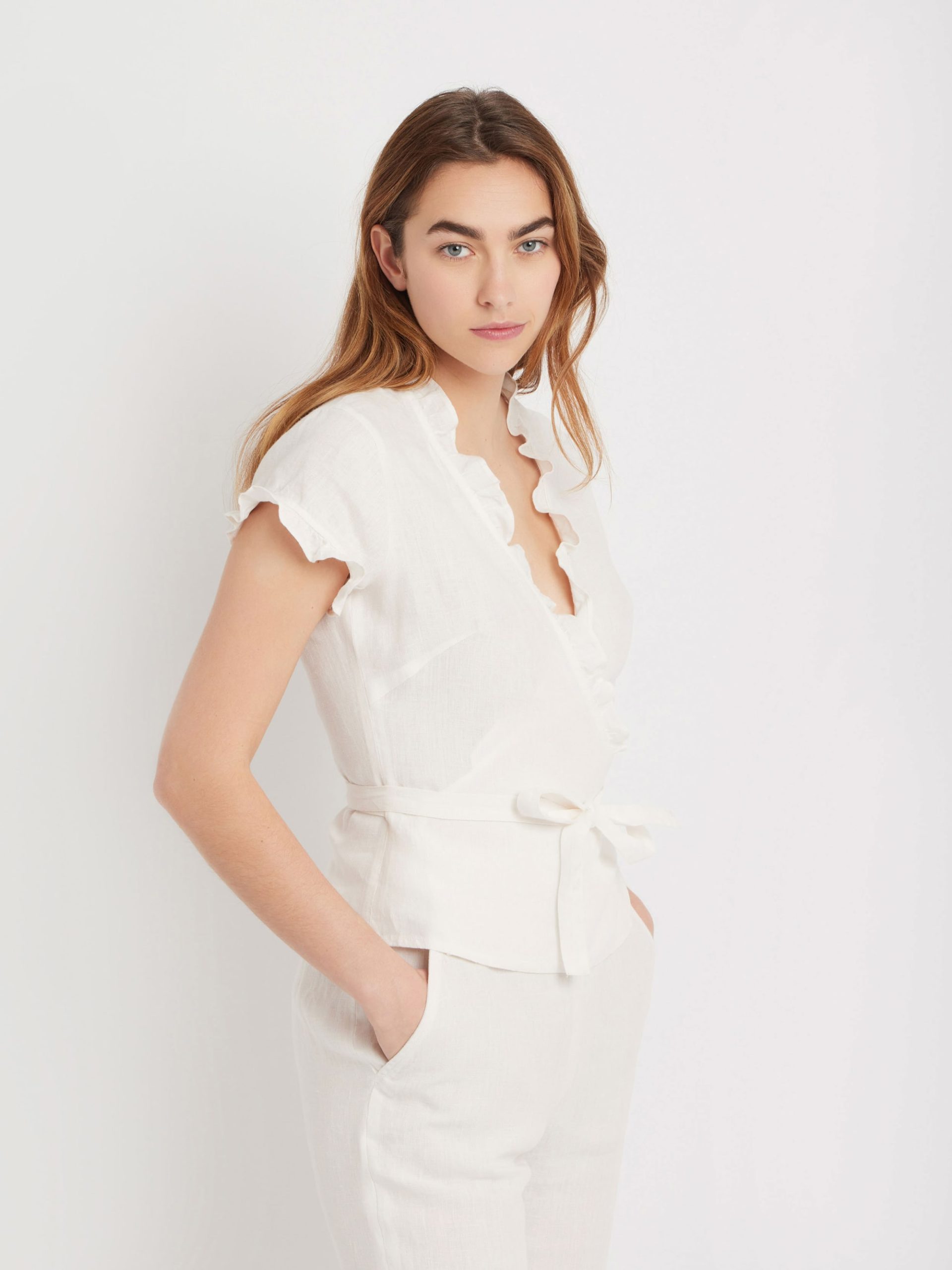 This ruffled wrap shirt is made of pure linen, a light breathable fabric, ideal for summer. This fabric is woven and dyed in Belgium, with Masters of Linen® certification.