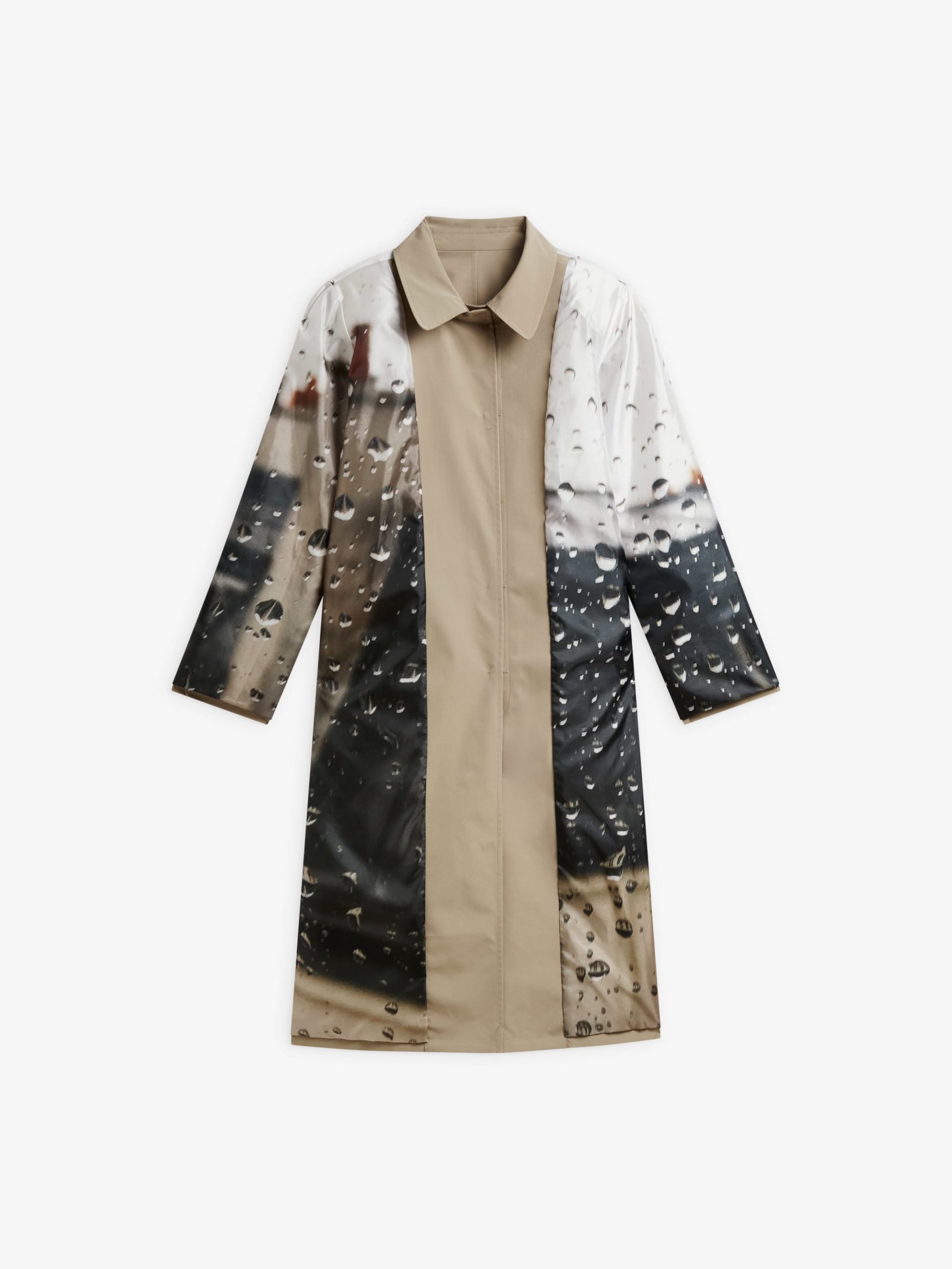 This belted water-repellent trench coat reveals a poetic secret: the lining features a digital print of “La Pluie à Paris (The Rain in Paris),” a photograph by agnès.