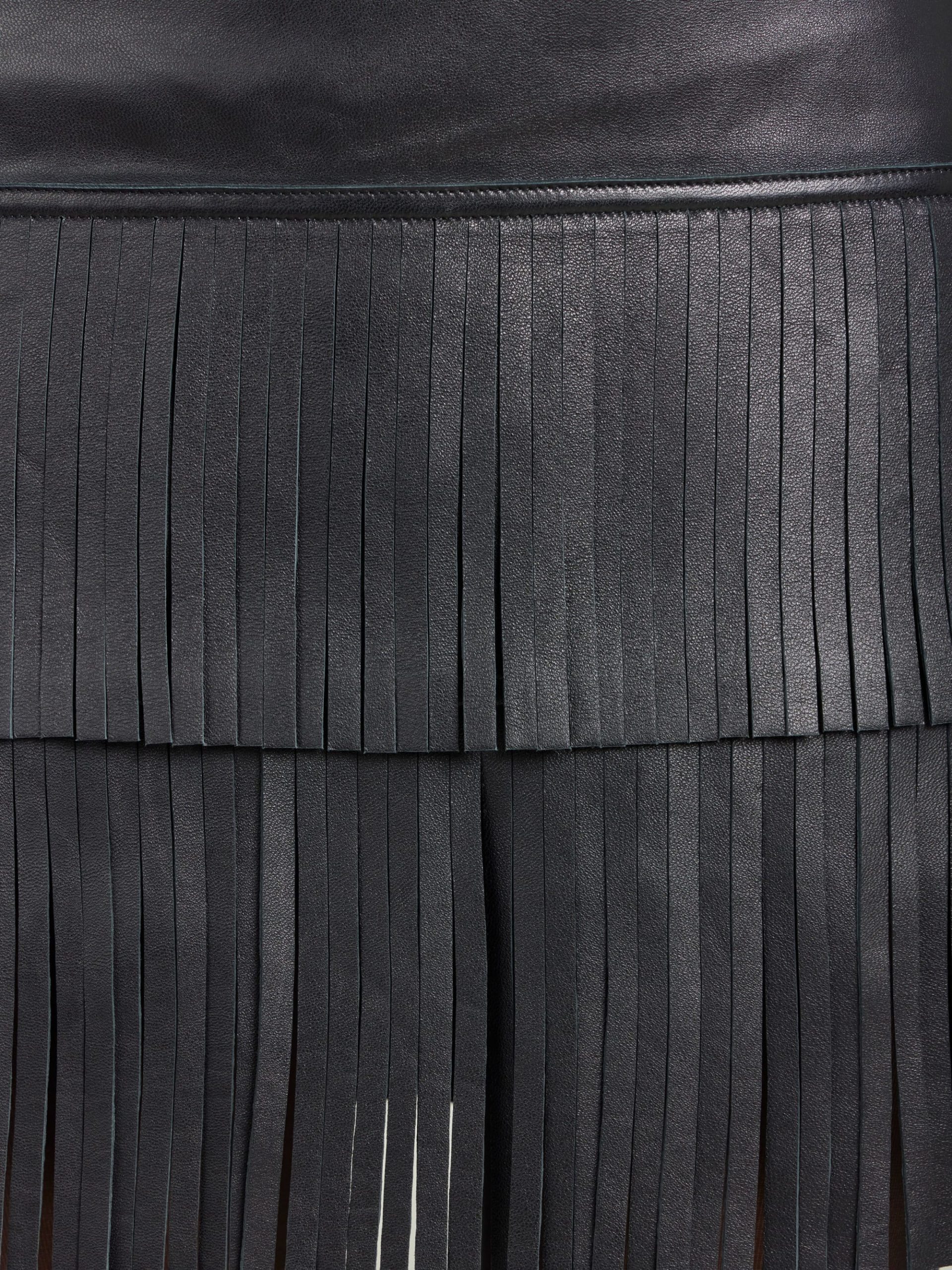 – Fringed hem for added dimension- 100% lambskin leather- Short skirt- Fully lined skirt