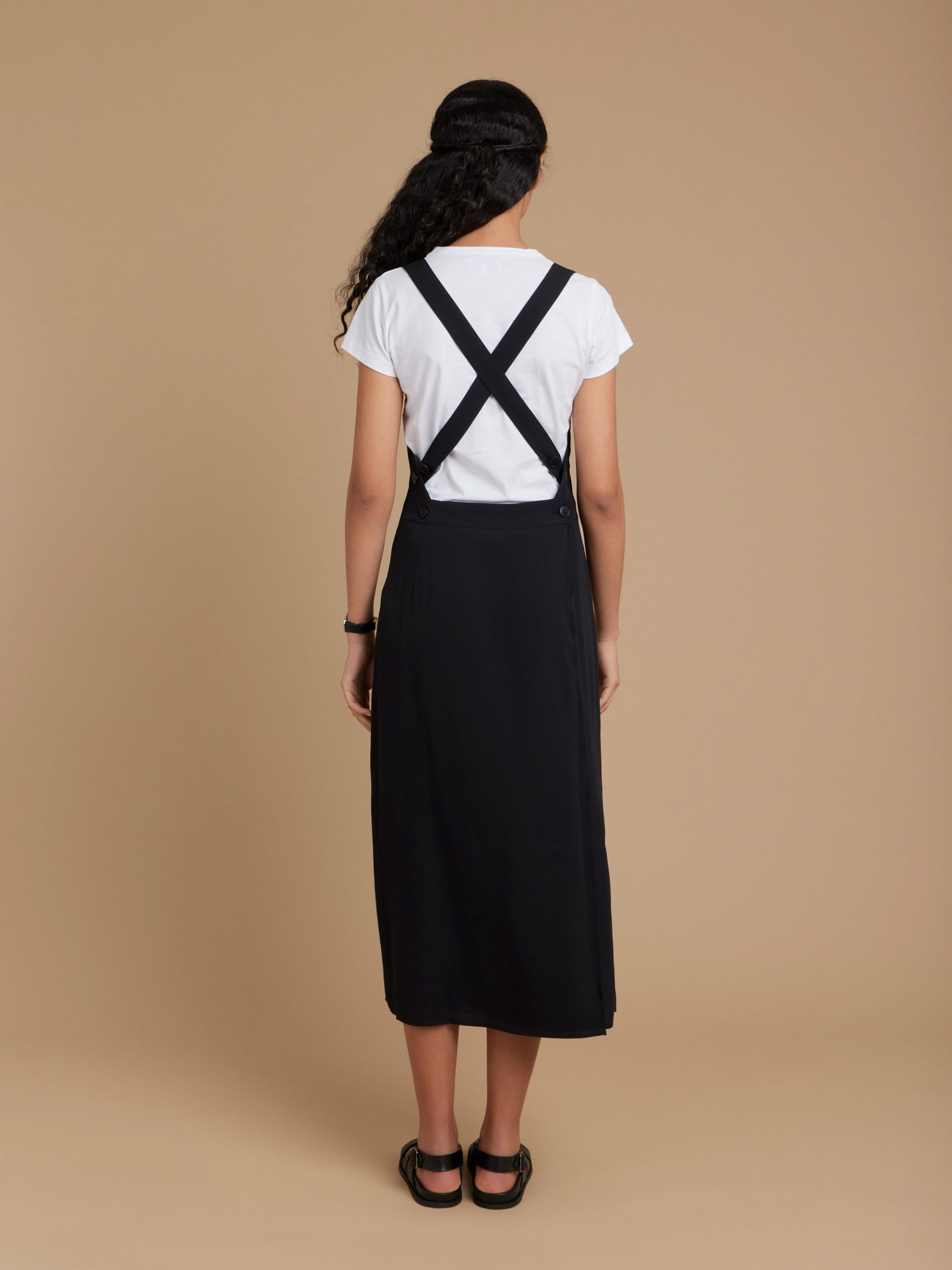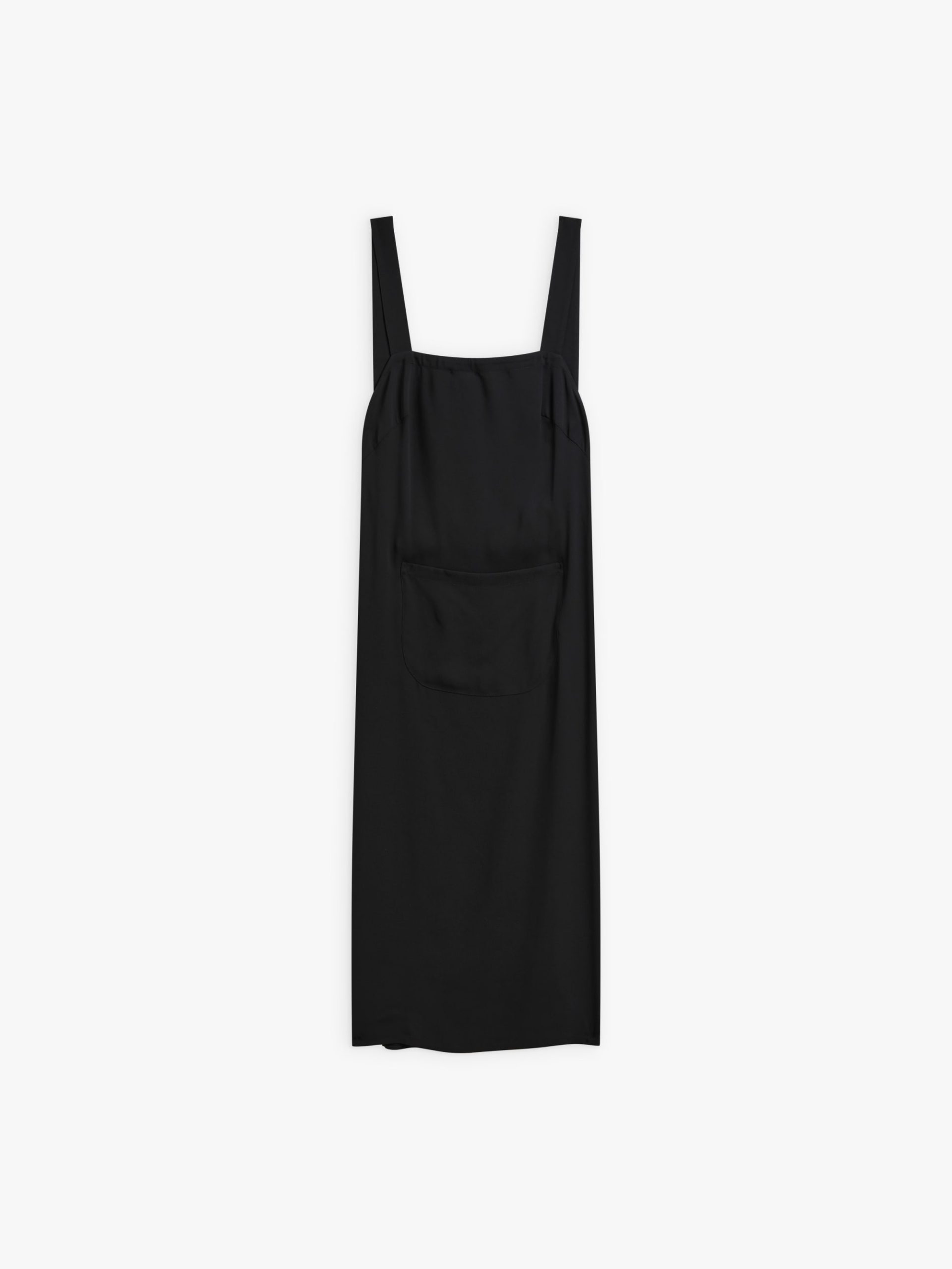 This elegant yet functional apron dress is crafted from fluid polyester crêpe, offering a soft drape and structured silhouette. The adjustable shoulder straps with button fastenings provide a customizable fit. A front patch pocket enhances practicality, making it a versatile piece for layering over tops or wearing on its own.