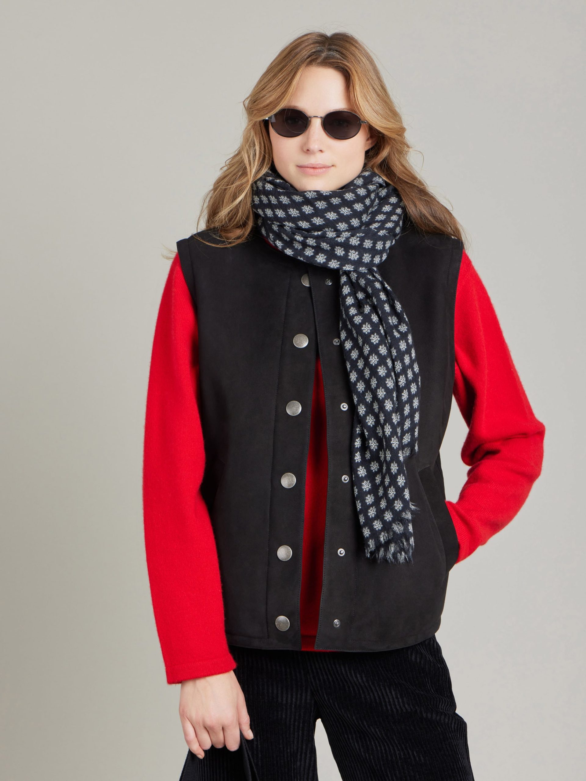 – Round neck- Sleeveless- Snap button fastening- Large welt pocket- Made in France