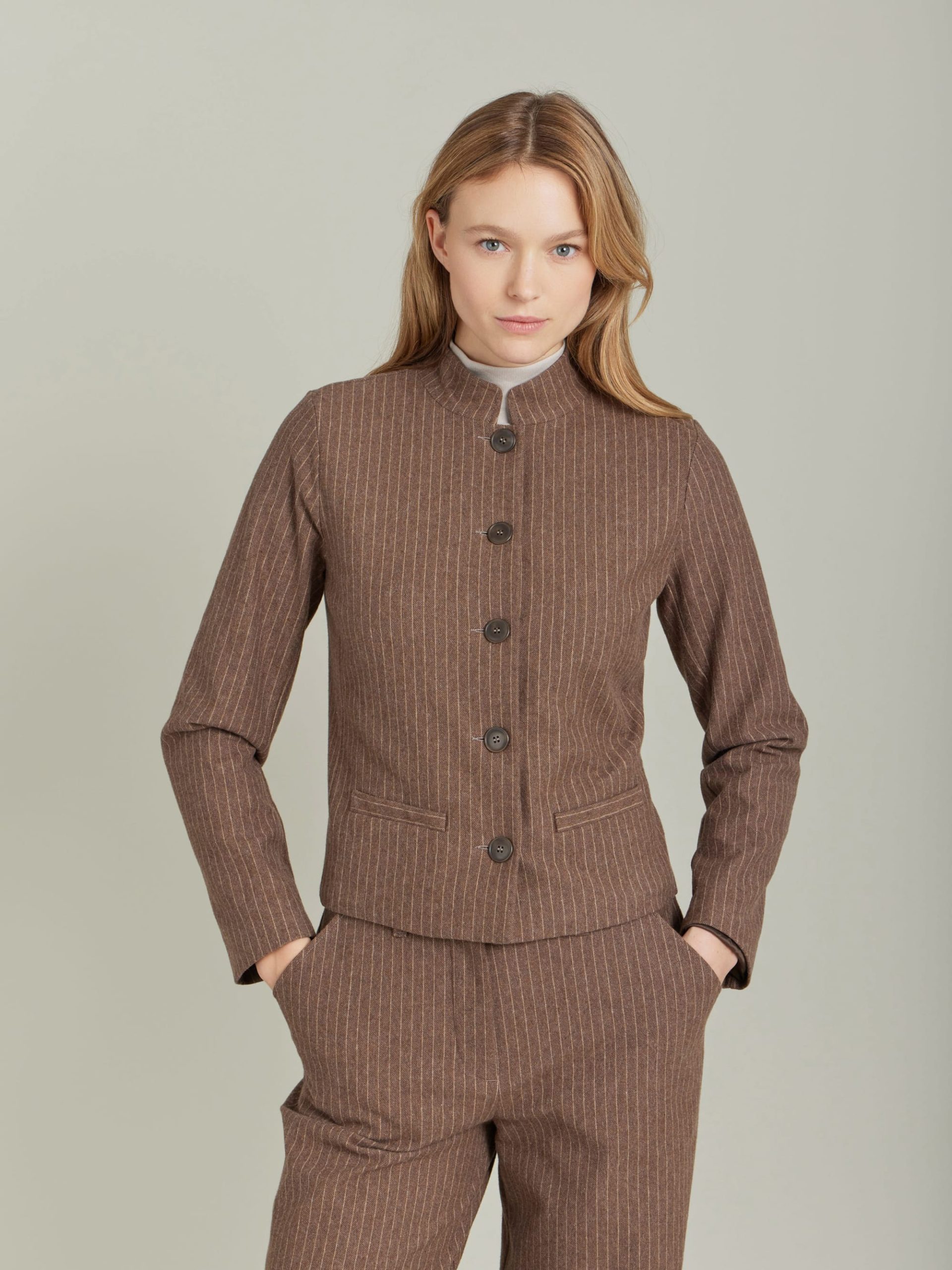 This elegant Lanna cotton twill jacket features a sophisticated, thin stripe pattern that enhances its timeless style. Designed with a stand collar and a sleek silhouette, it exudes a polished look perfect for any occasion.