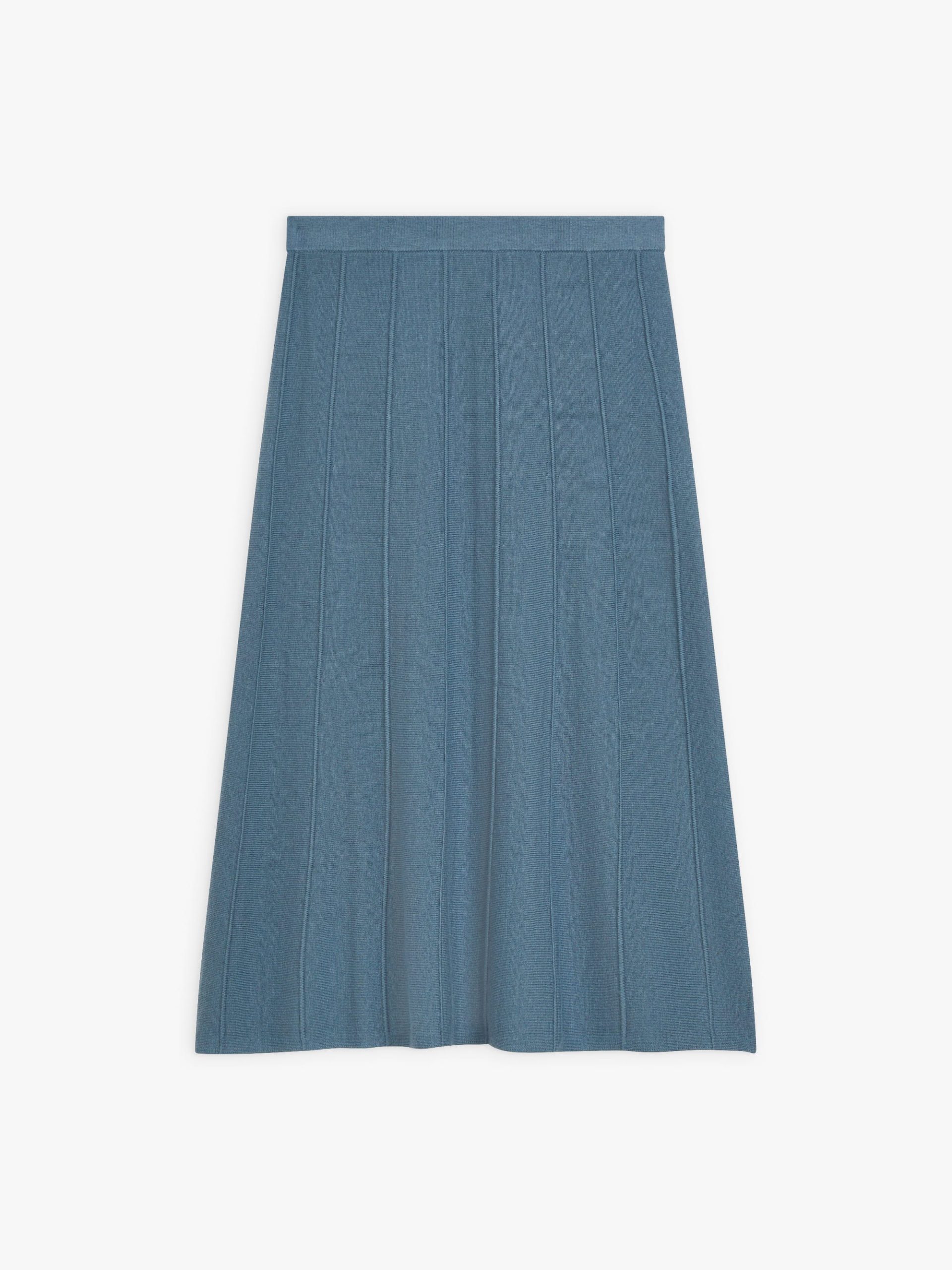 This wool skirt features a mid-length, flared silhouette with fine vertical grooves.The fabric creates a perfect balance between structure and fluidity.Minimal and versatile, it pairs effortlessly with the matching grey wool Girouette sweater, sold separately, for a coordinated look.