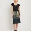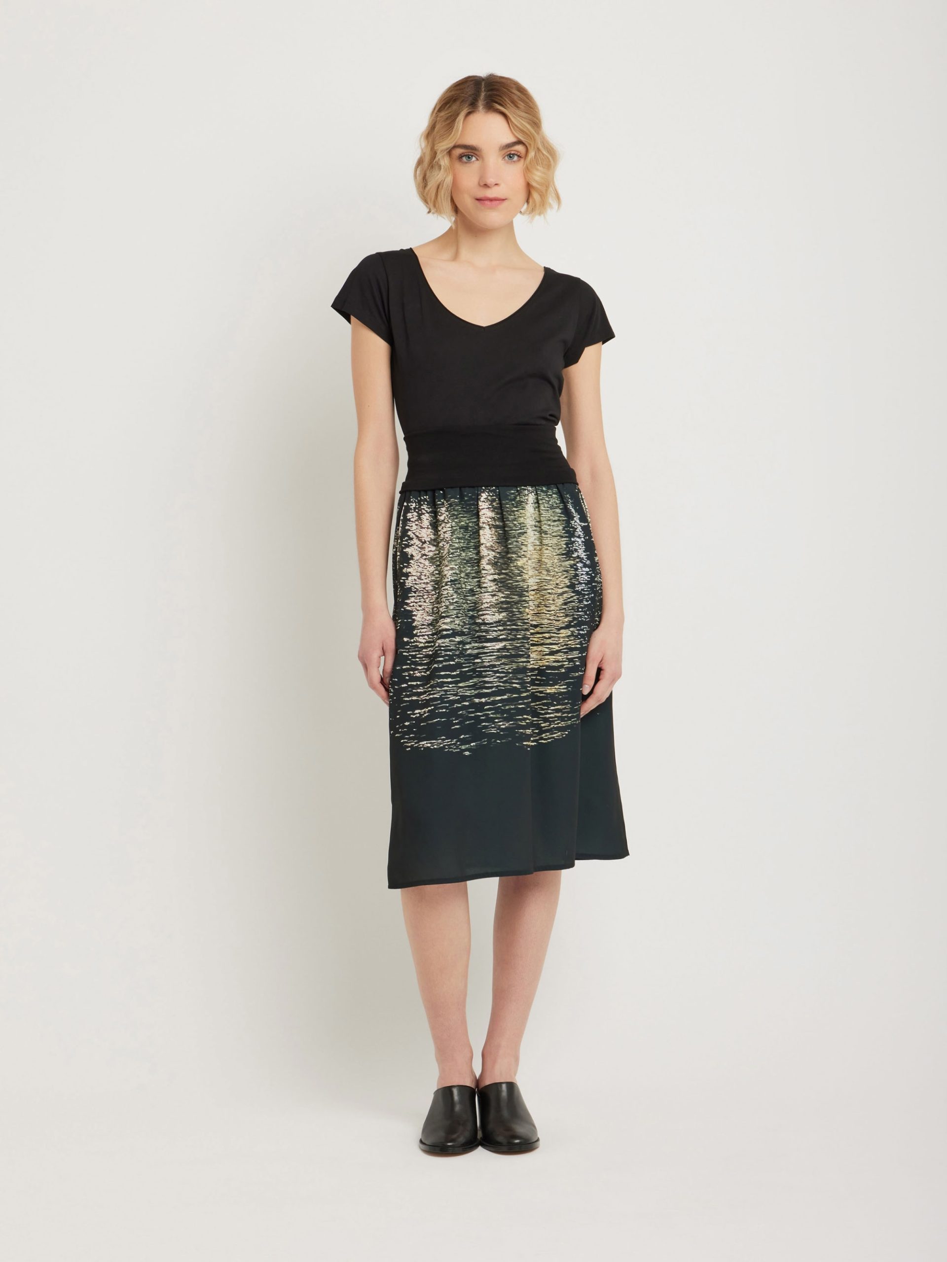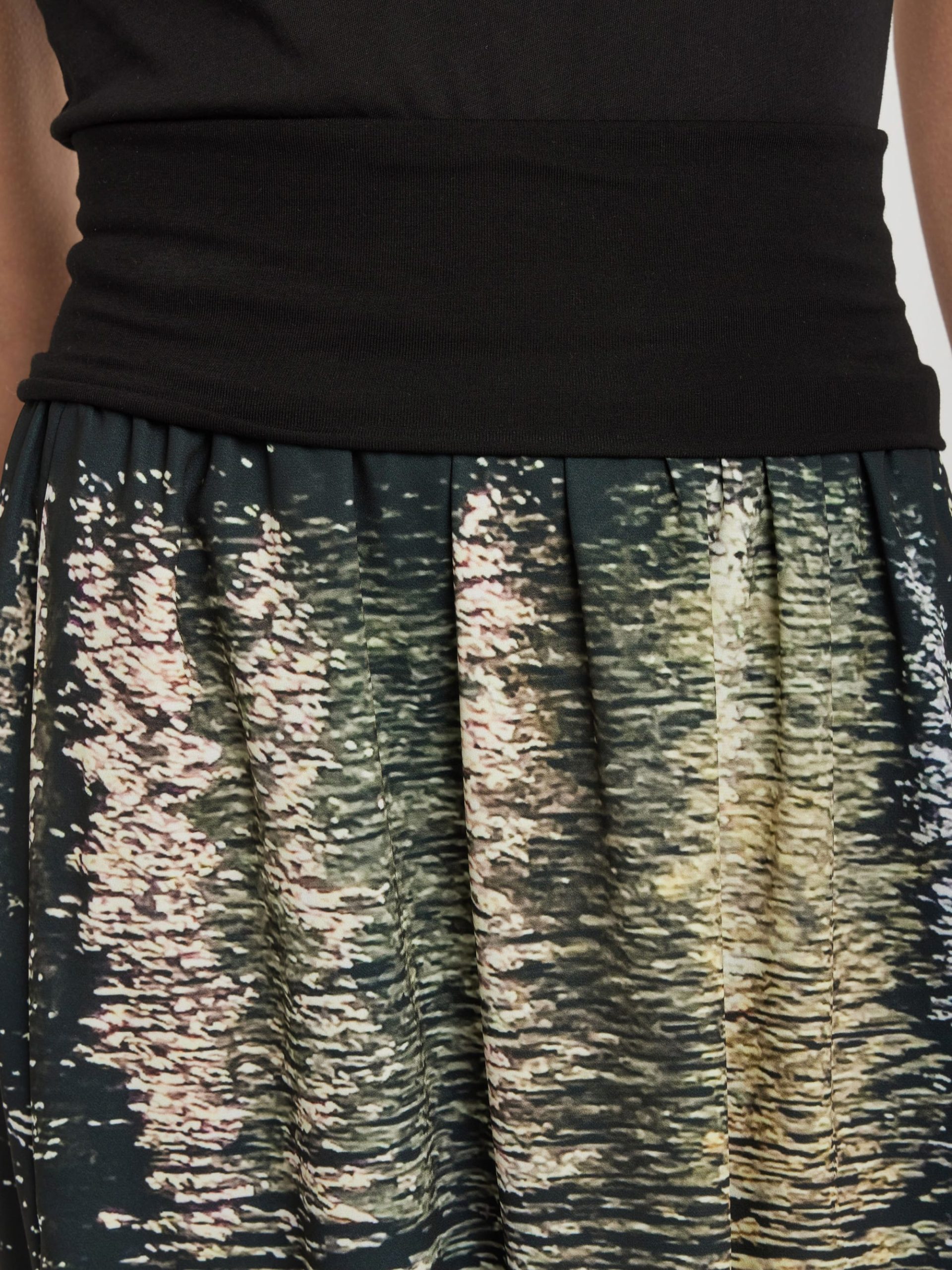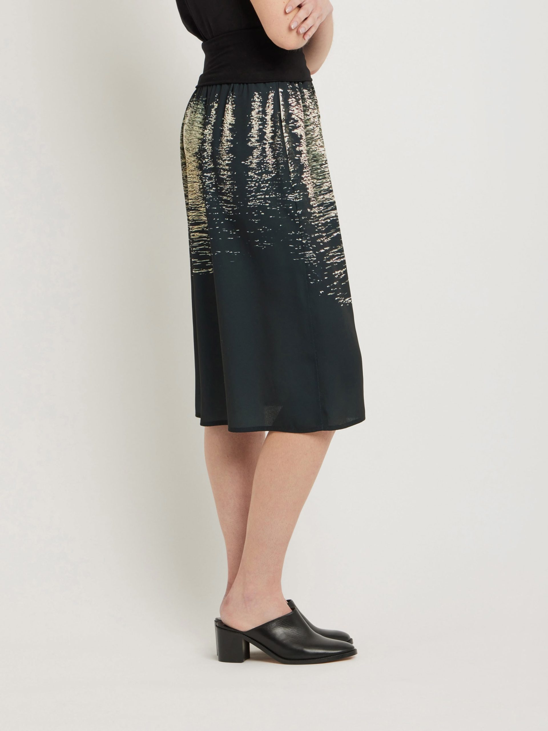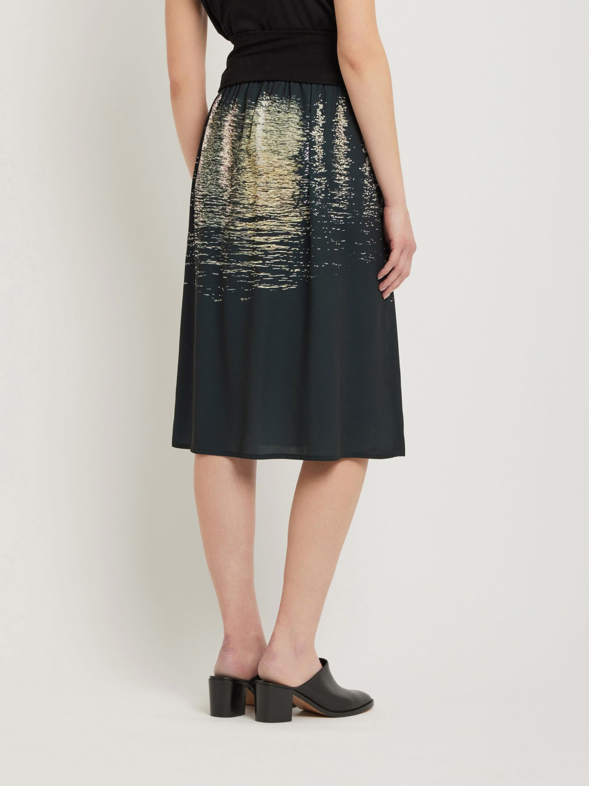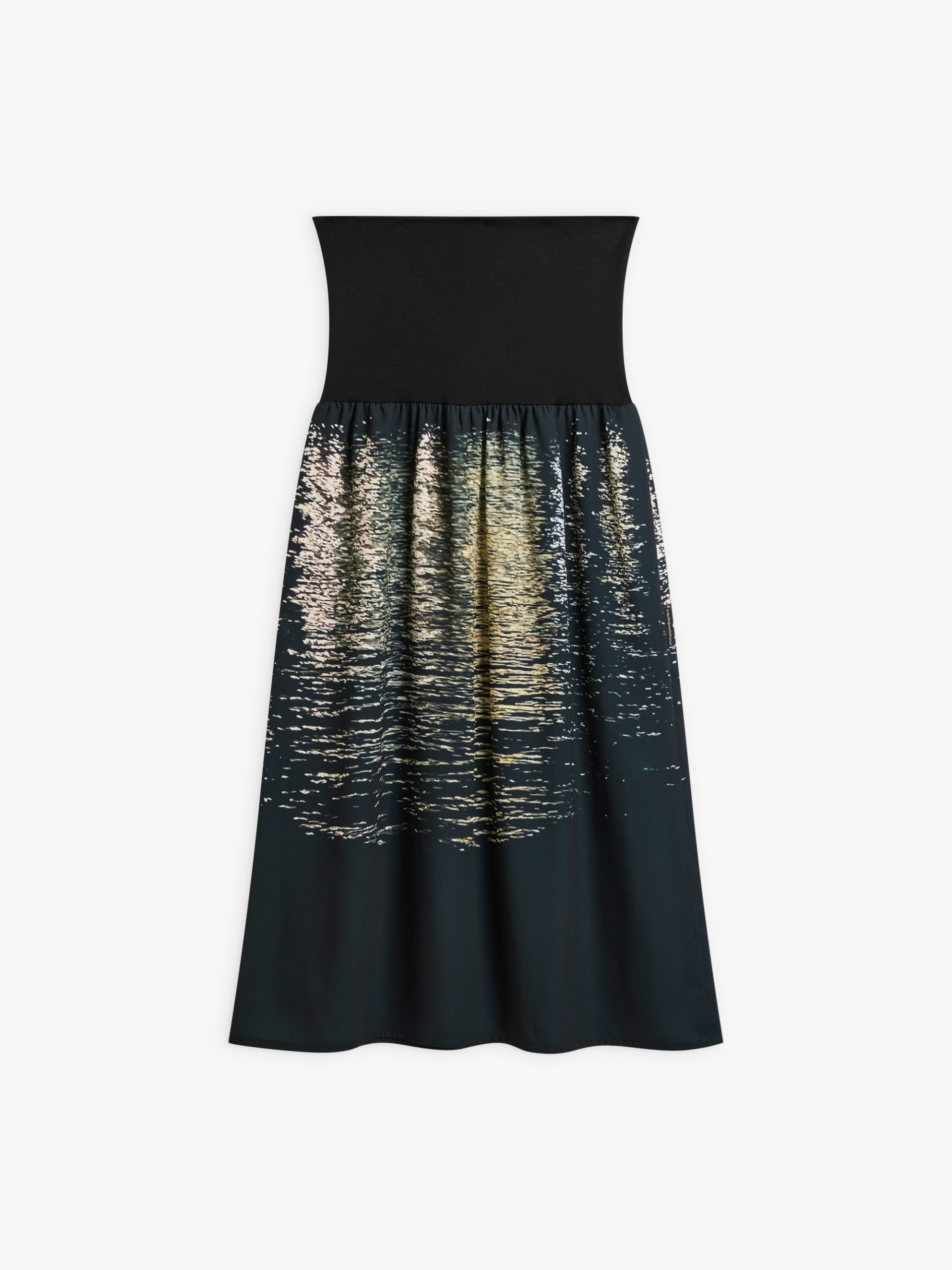 – Straight silhouette- Knee-length- Soft ribbed waistband for a comfortable fit- Elegant digital print inspired by the sea at night