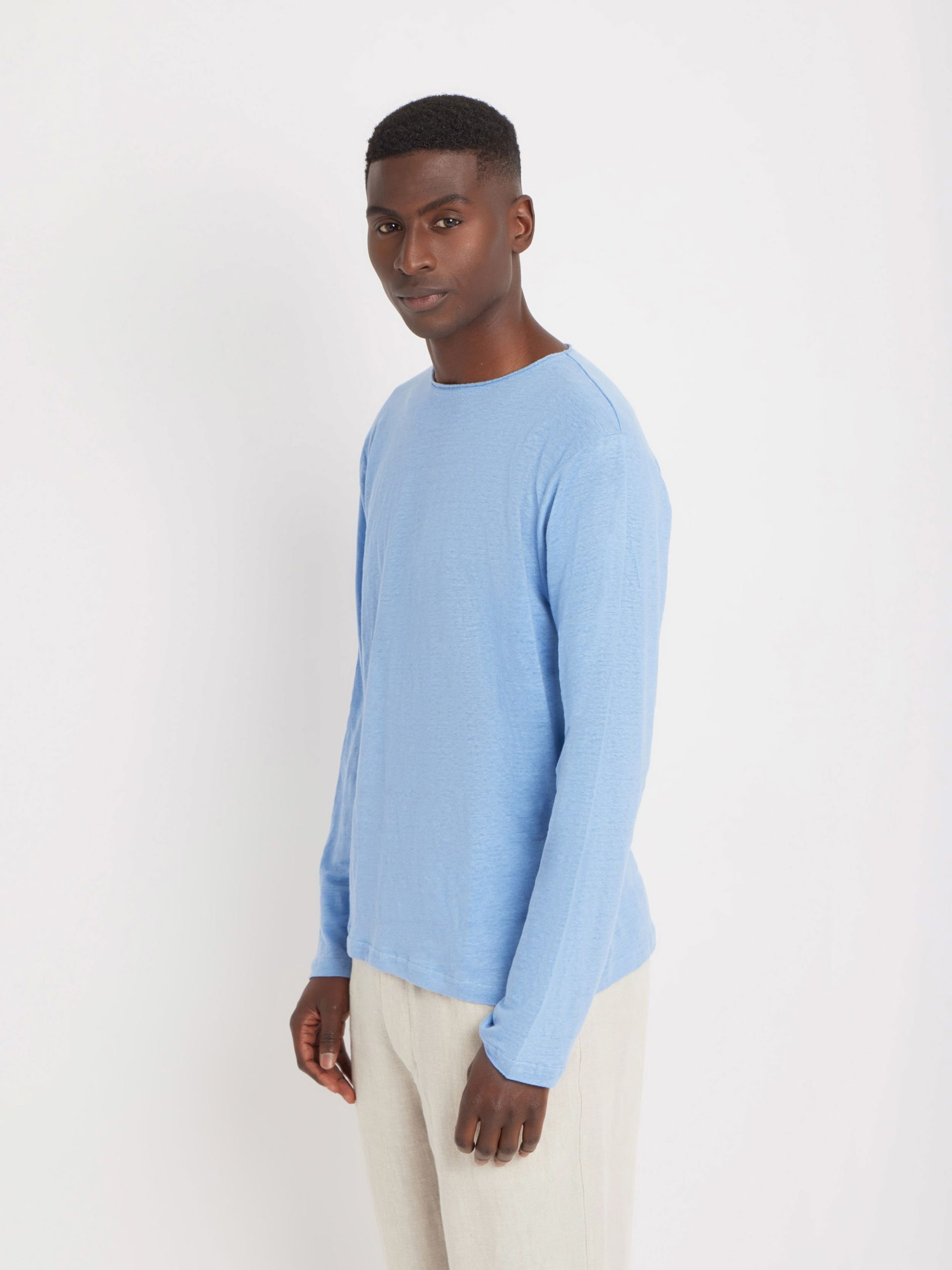 – Crew neckline with rolled edge- Long sleeves- 100% linen