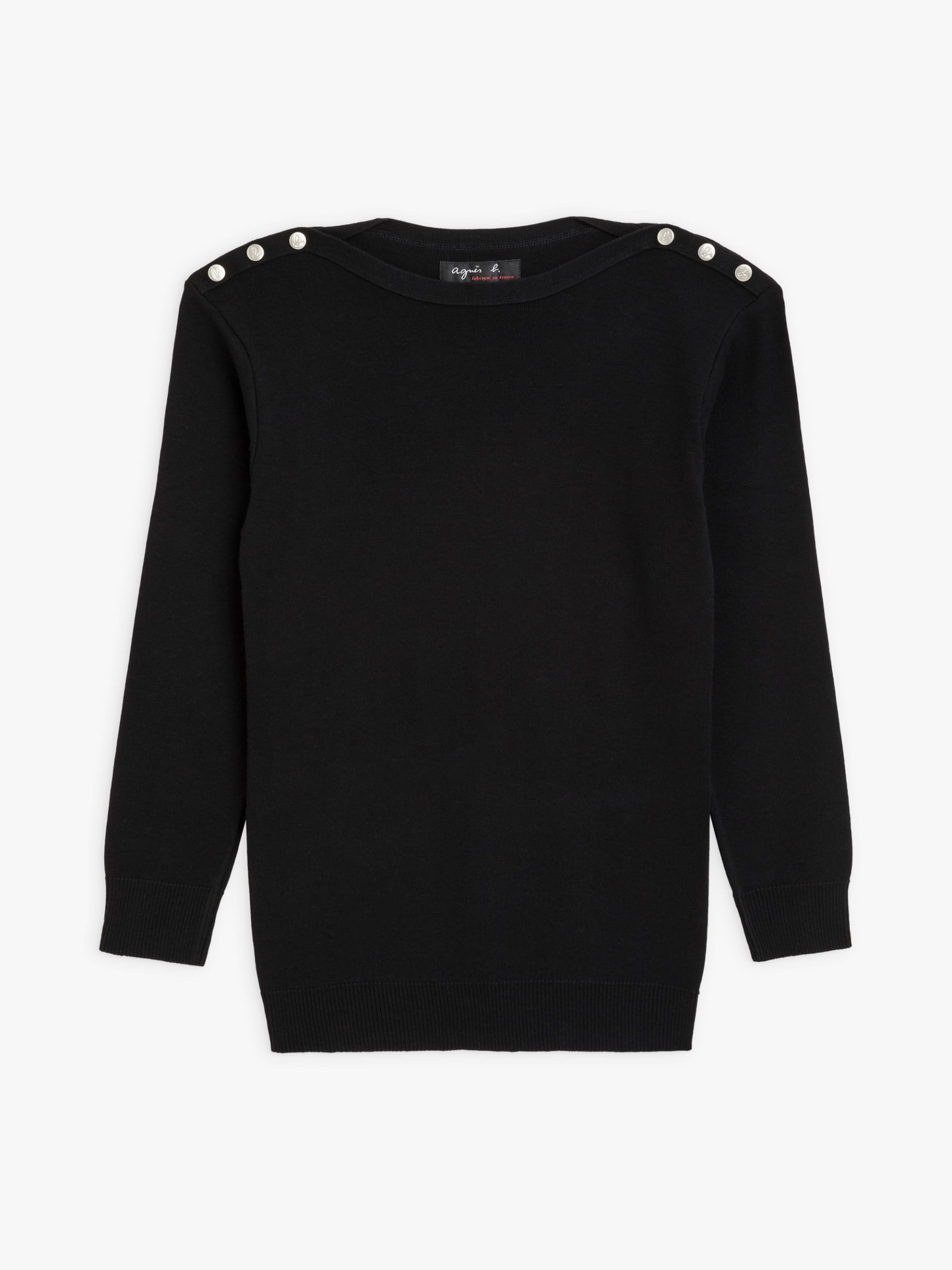 Made in France, the Badiane cotton knit sweater with 3/4-length sleeves has a boat neckline emphasized with “b.” engraved metal press studs.
