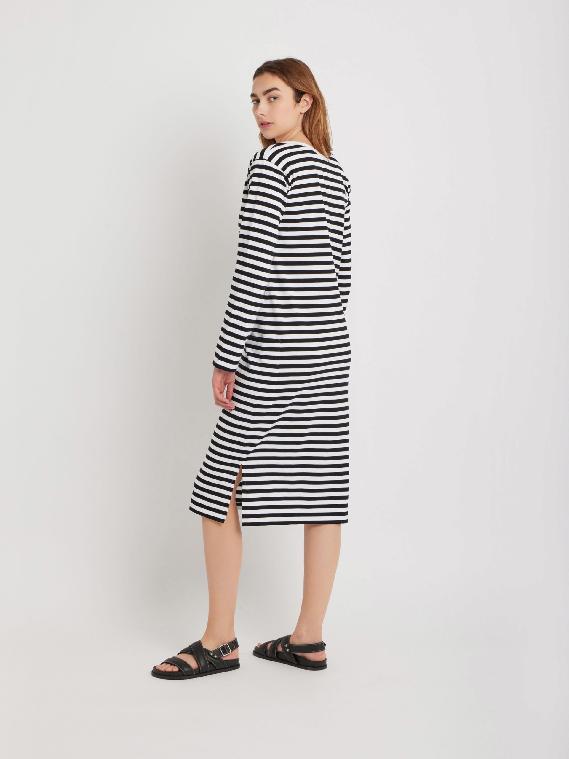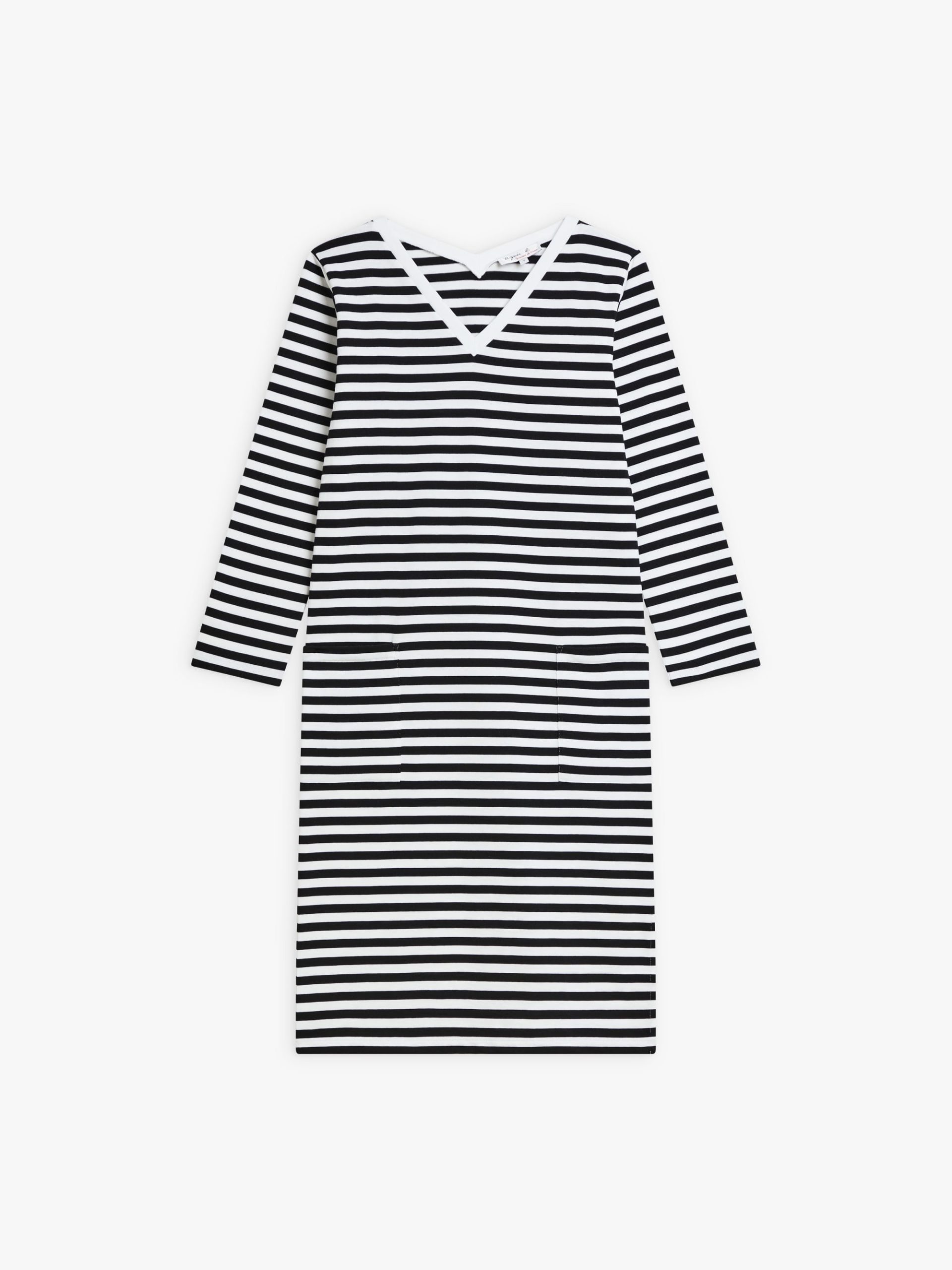 The Biarritz dress is crafted in 100% cotton with crisp vertical stripes and a clean V-neckline. With its tailored fit, wide long sleeves, and practical front patch pockets, this versatile piece is effortlessly chic.