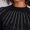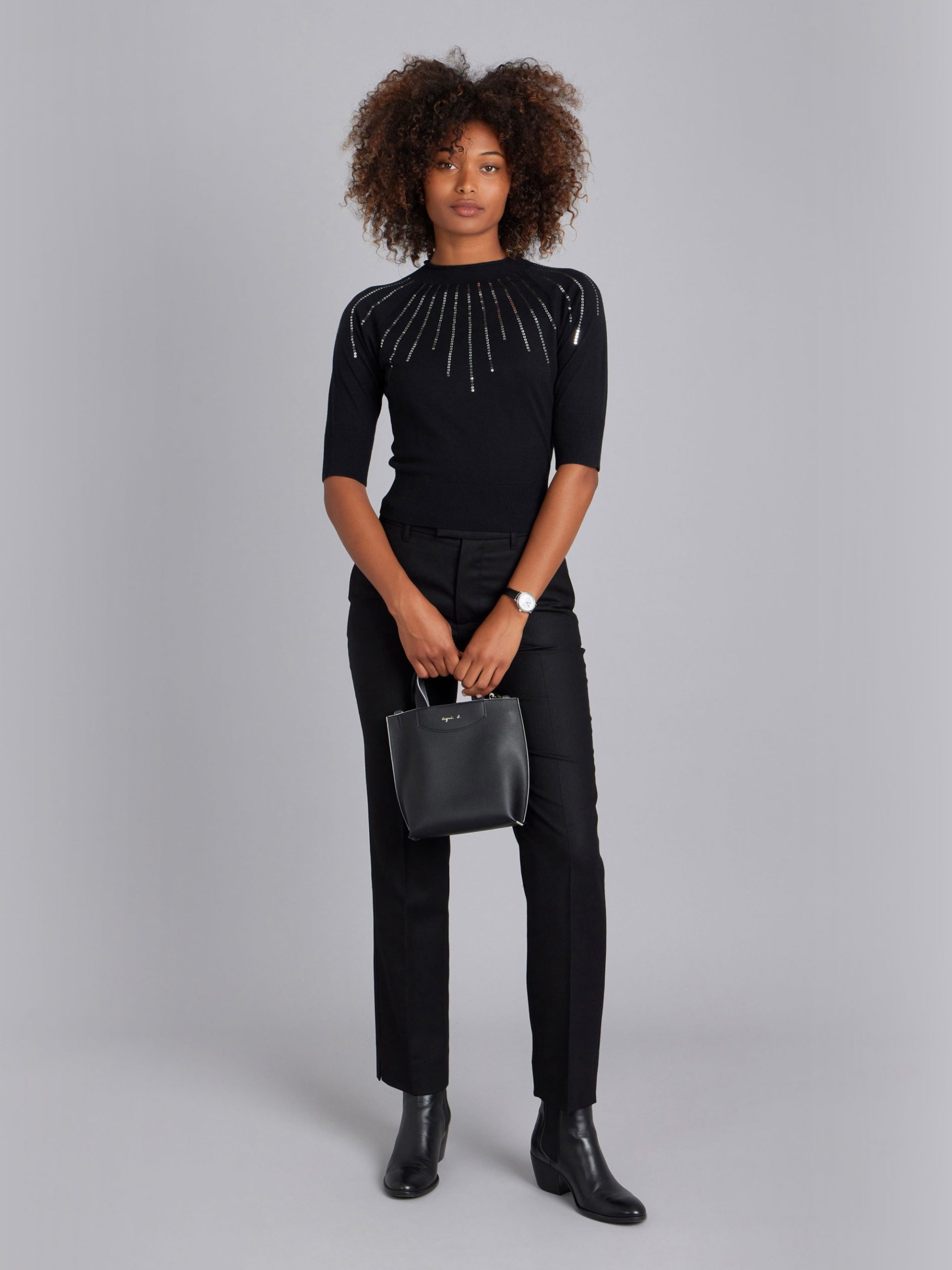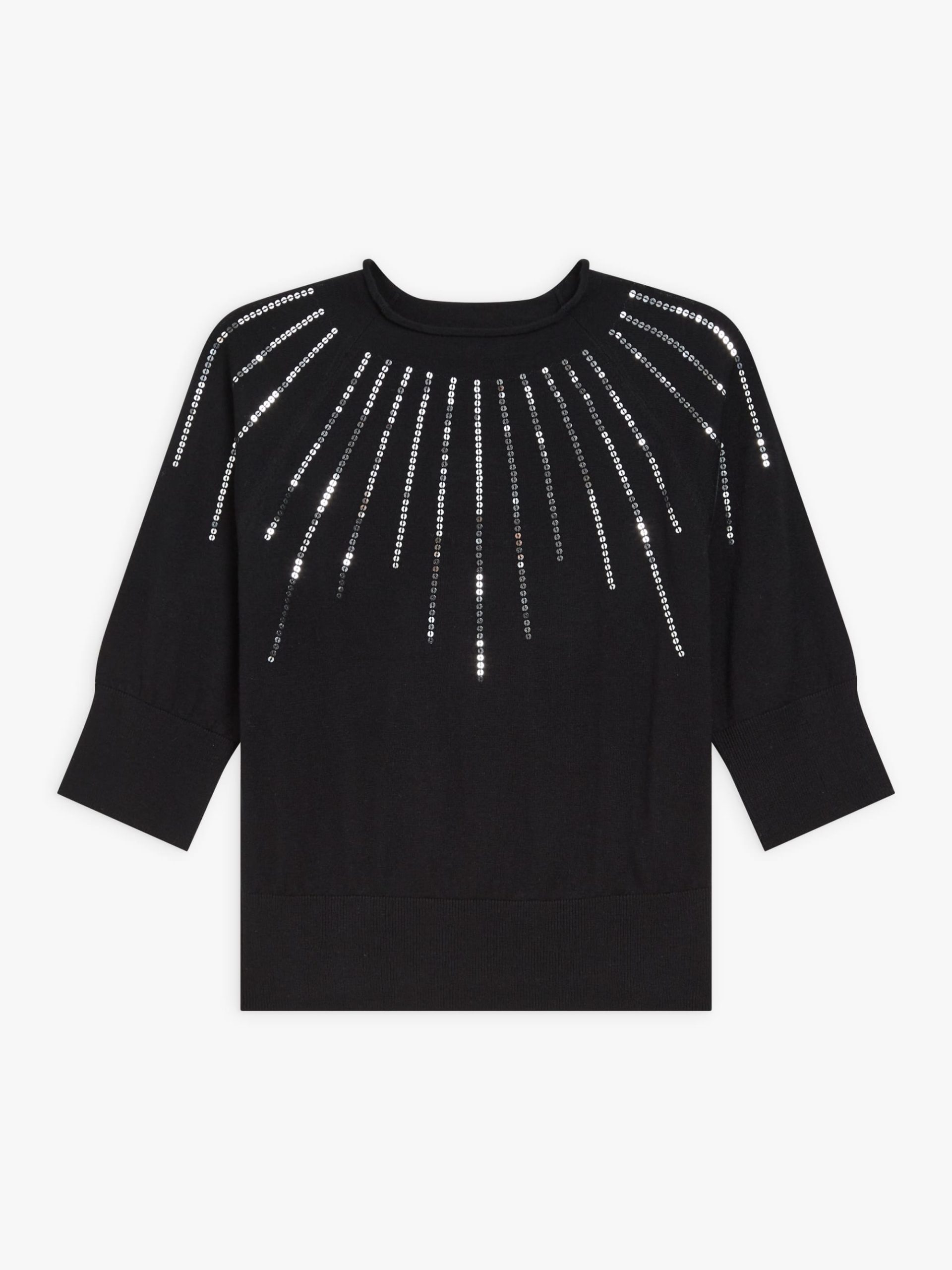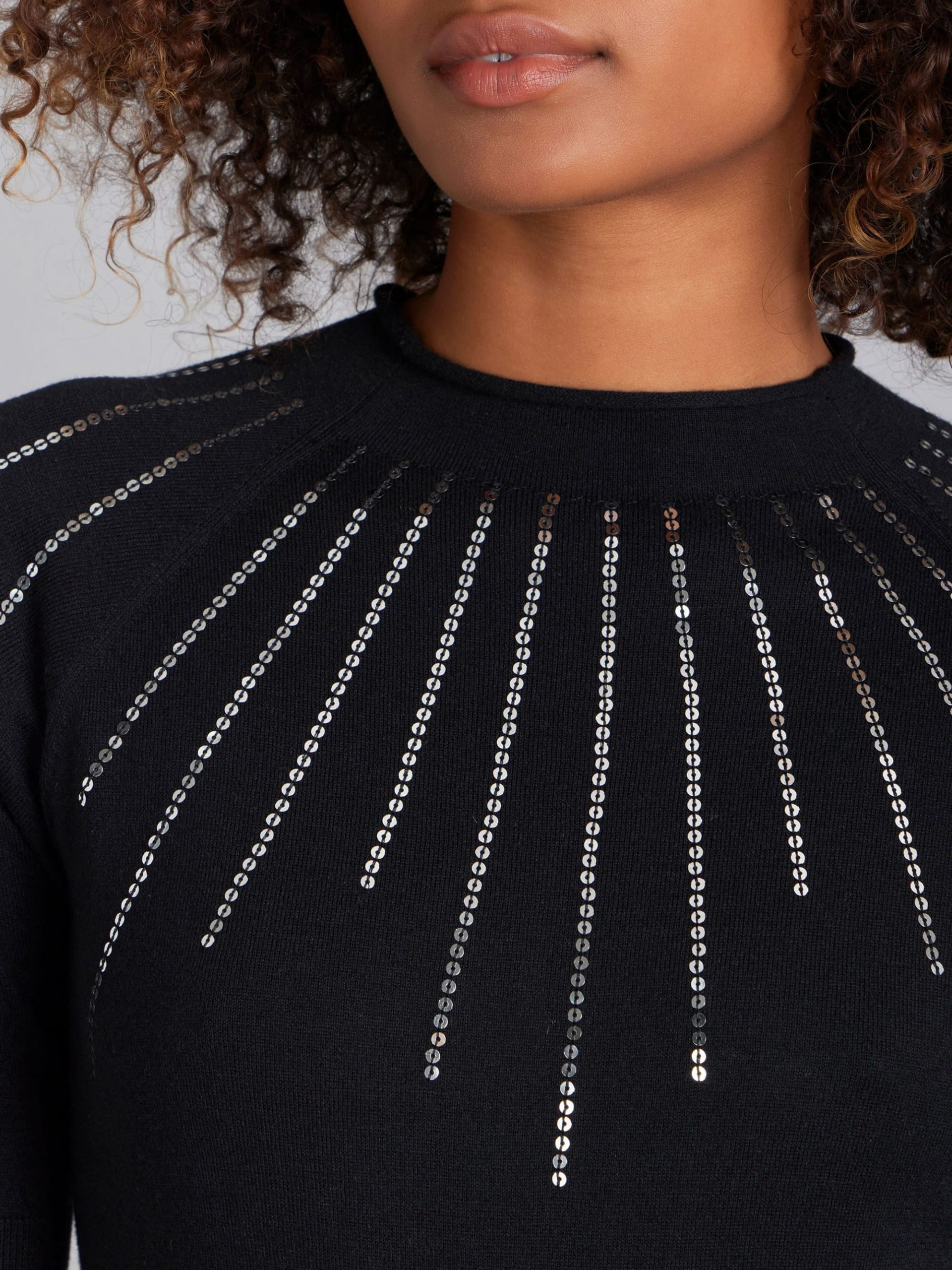 This sequin elbow-sleeve sweater features a funnel neck design and is made of a soft wool, cashmere, and silk blend.