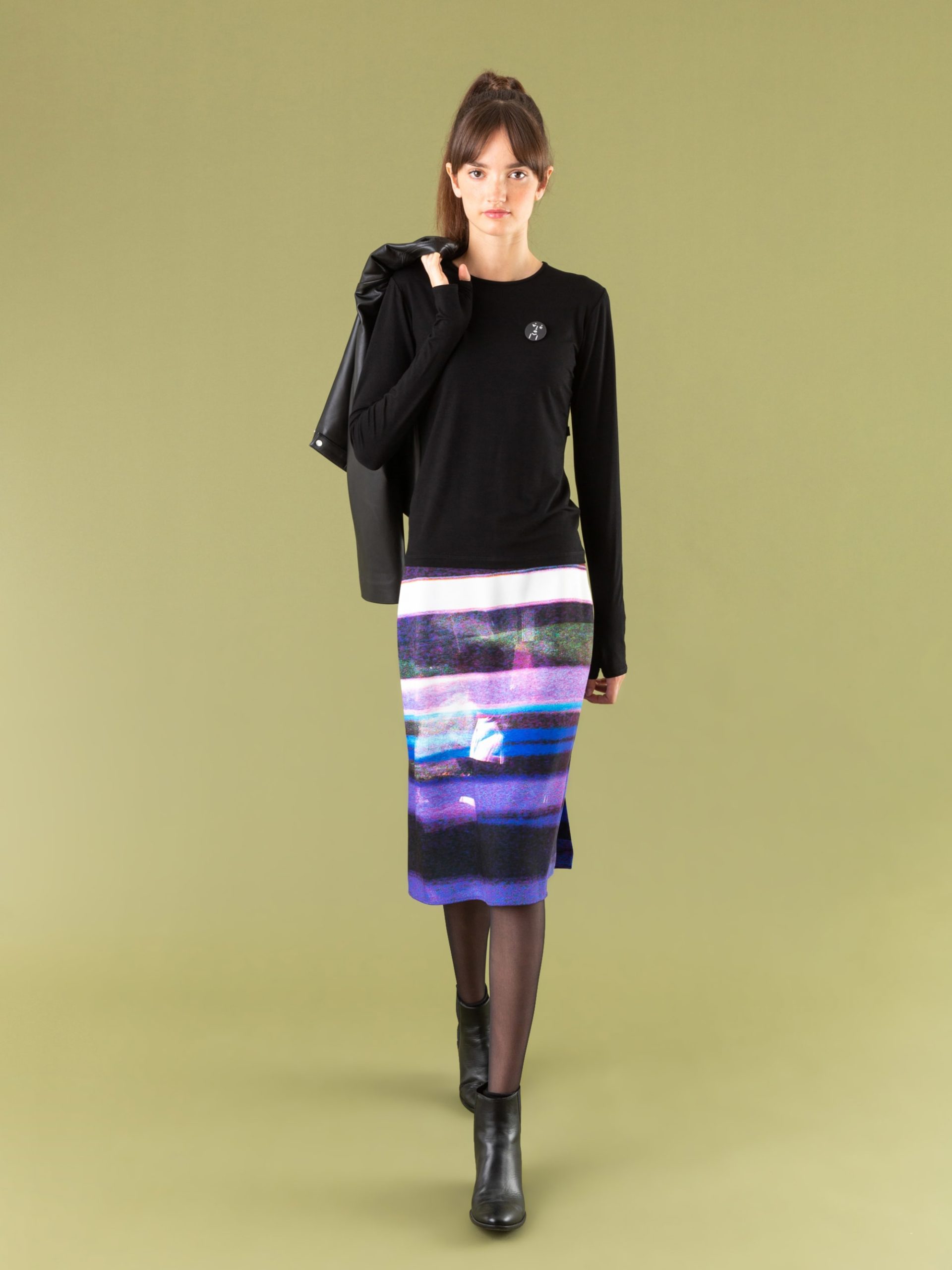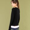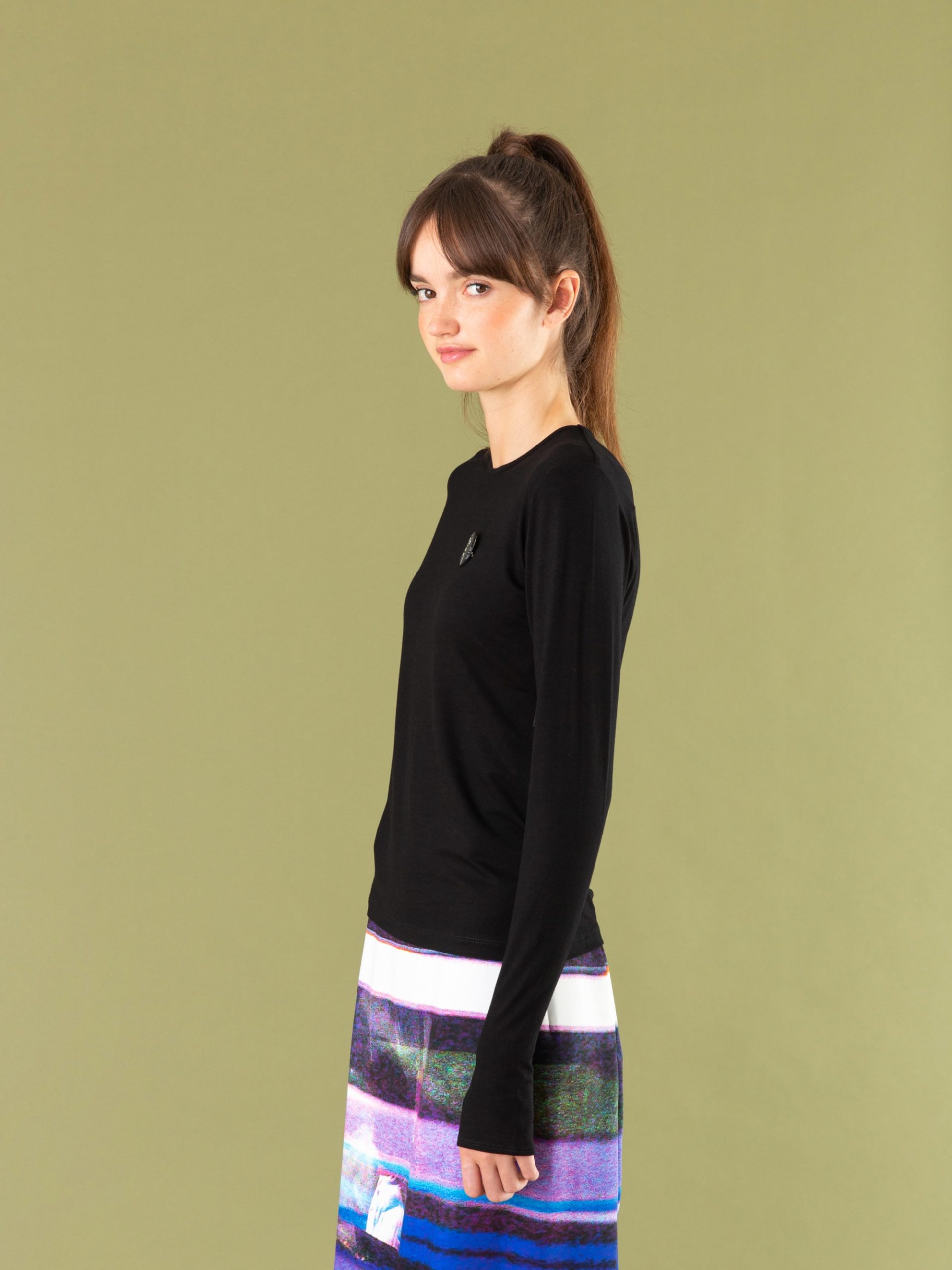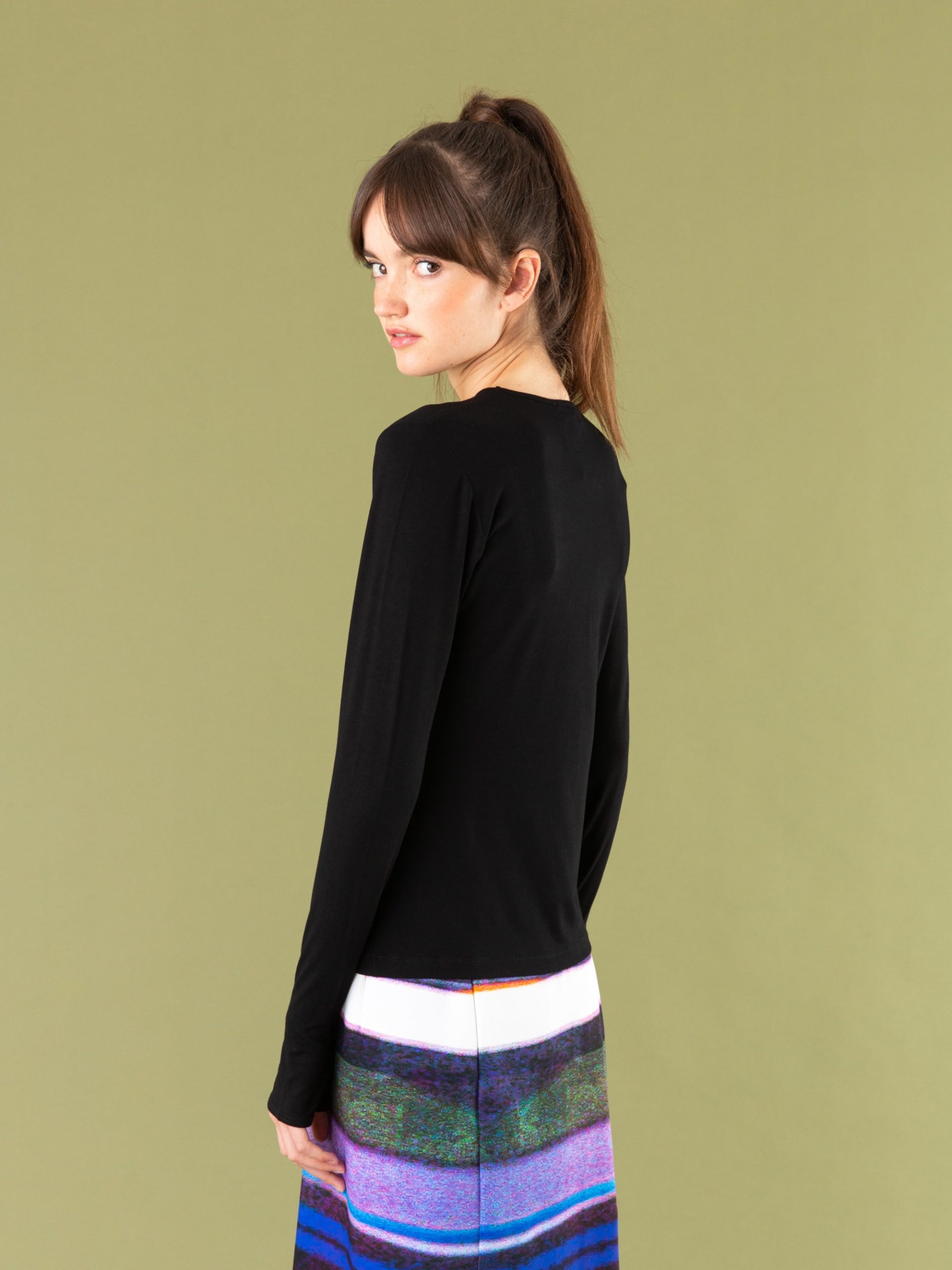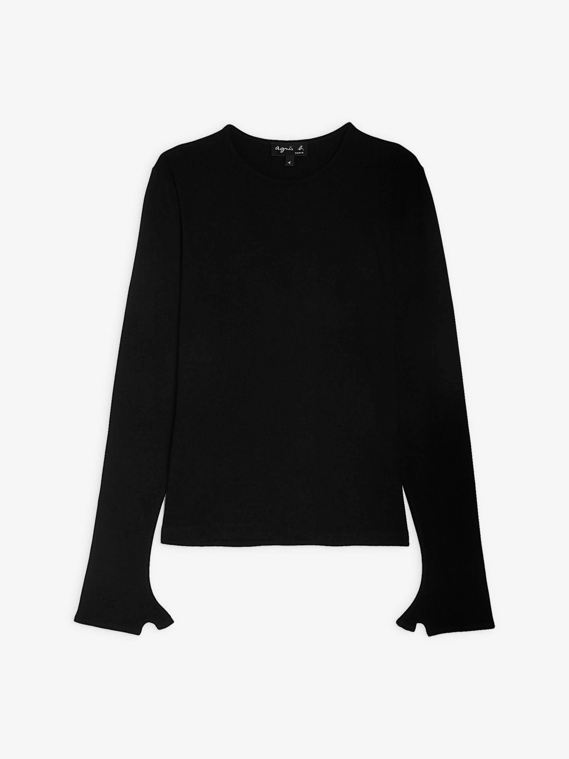 The chic Evening t-shirt features a classic crew neck and long sleeves with unique cuffs that can be worn as mittens.