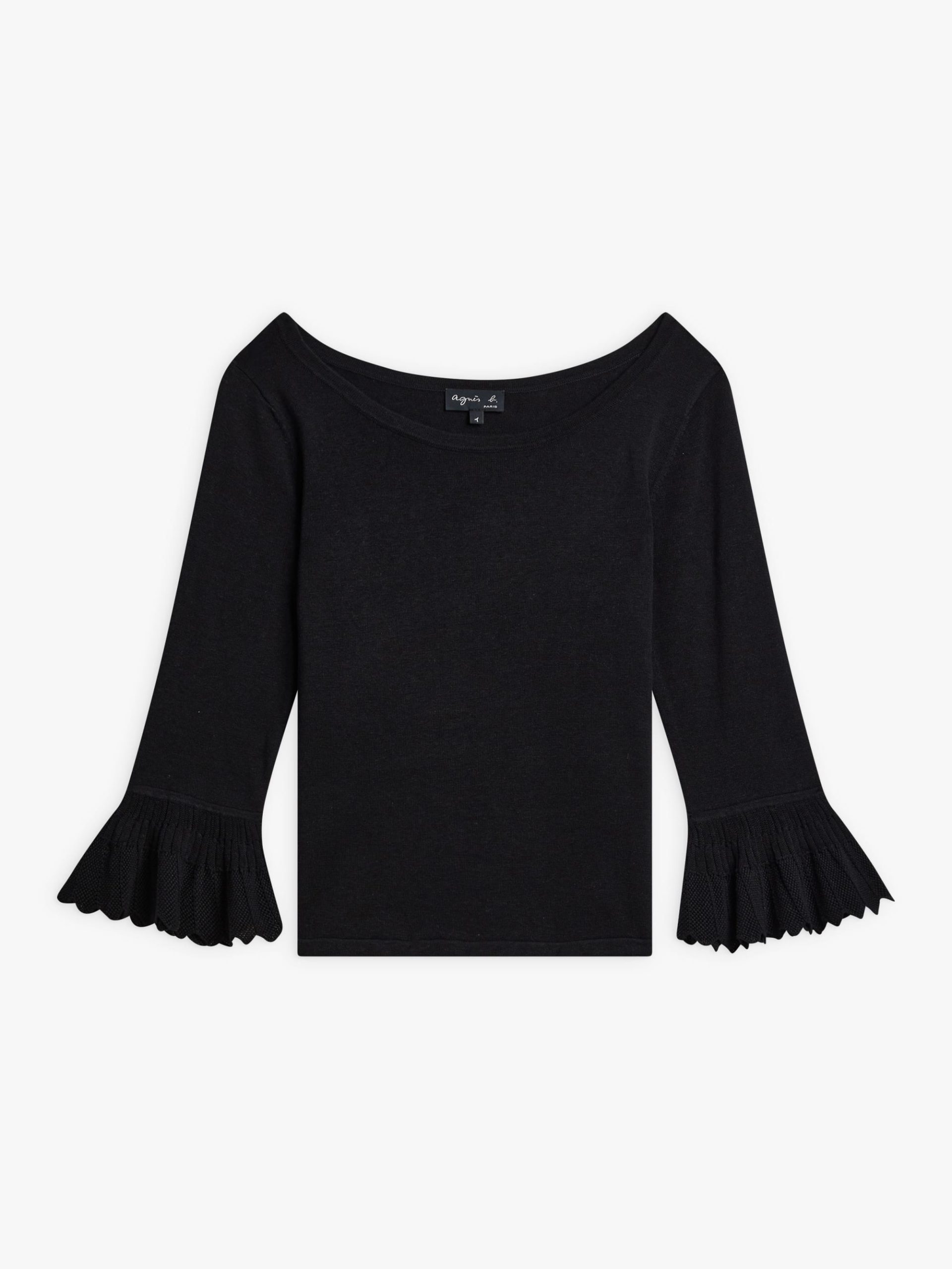 – Round neck– 3/4 length sleeves– Pleated flared cuffs with scalloped edges