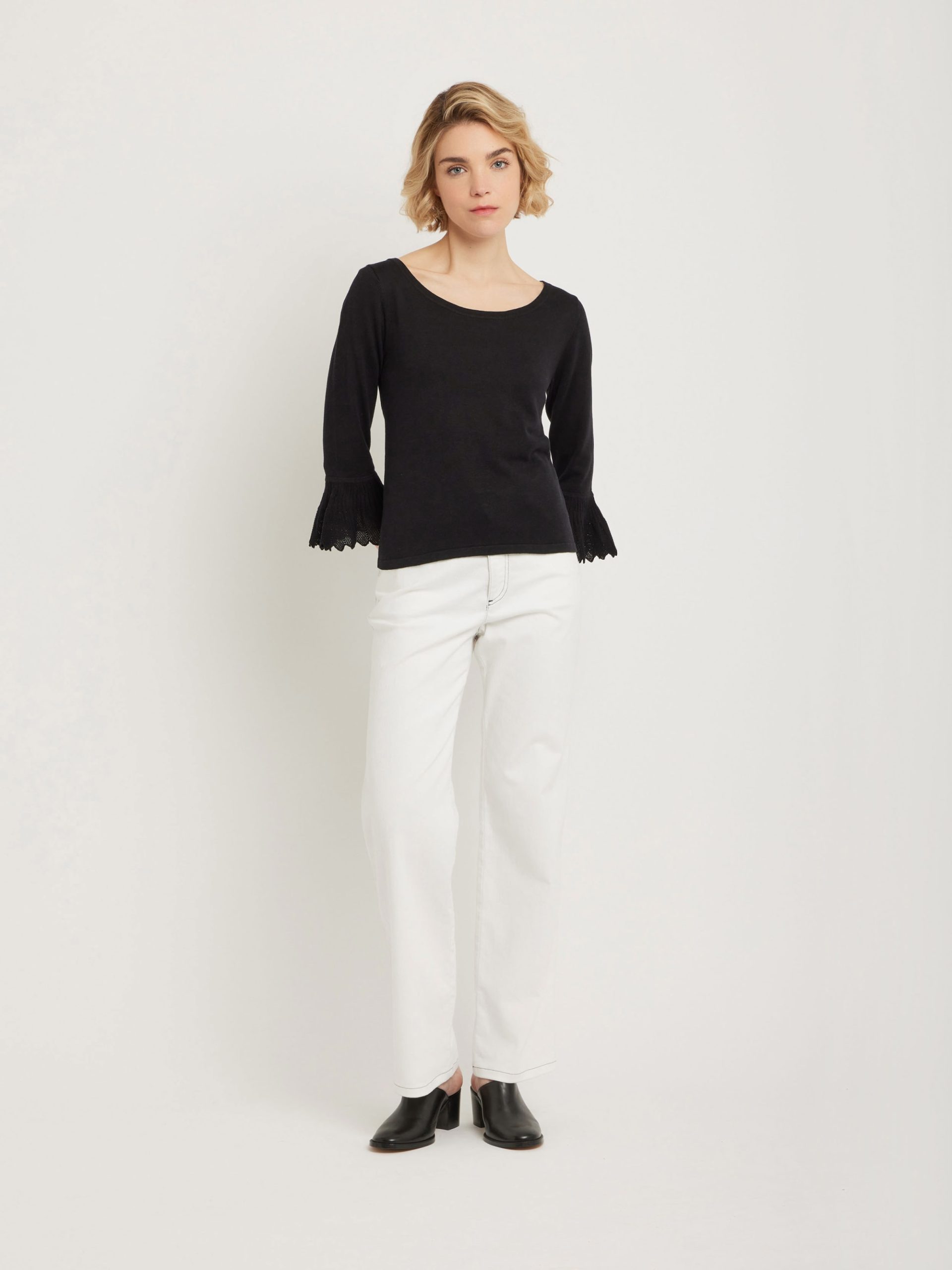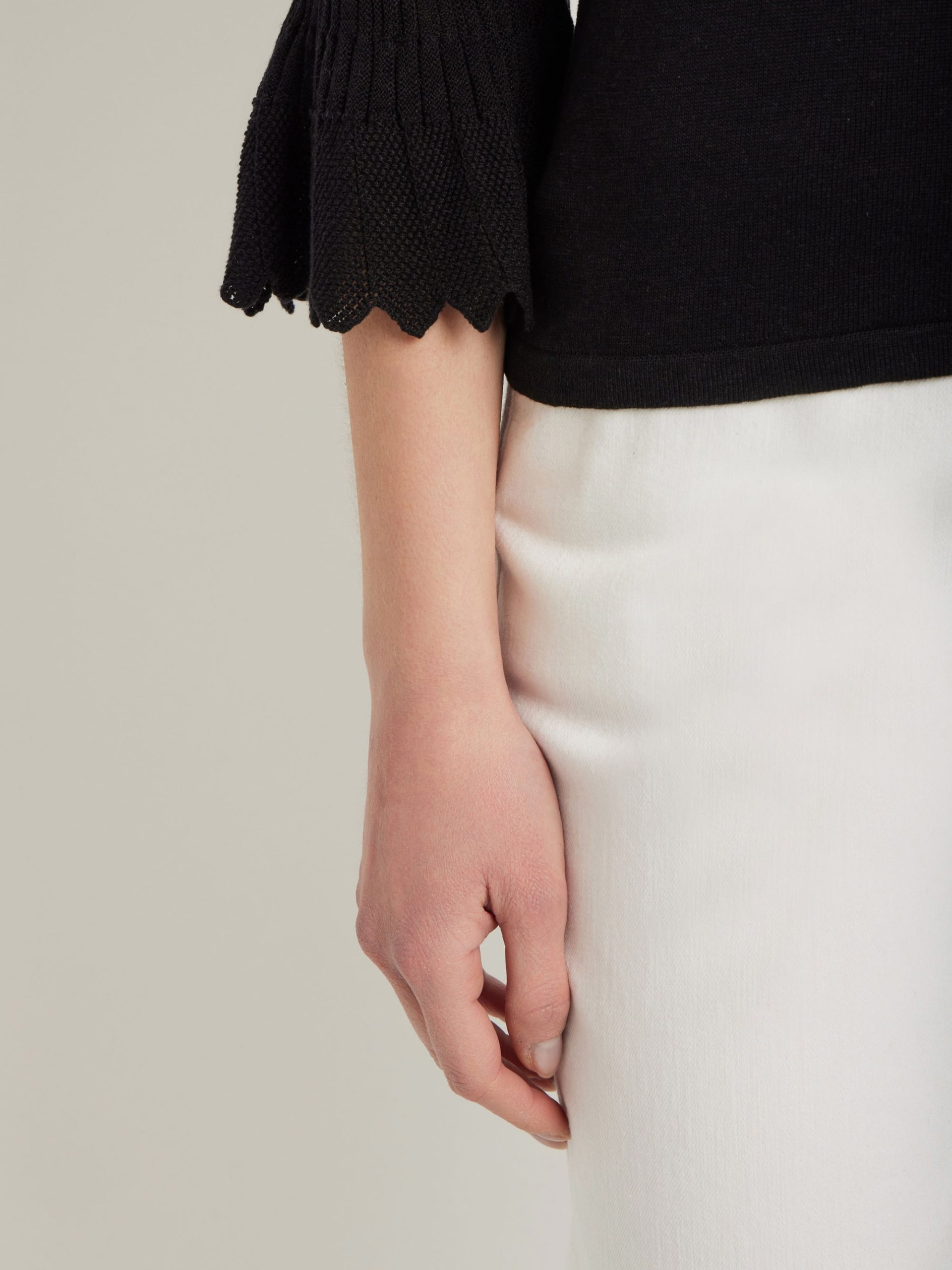 The Chantilly knit top blends natural texture with a touch of elegance. Crafted from a soft silk and linen blend, it offers a lightweight feel. The pleated flared cuffs with scalloped edges add a refined, feminine detail to the silhouette.