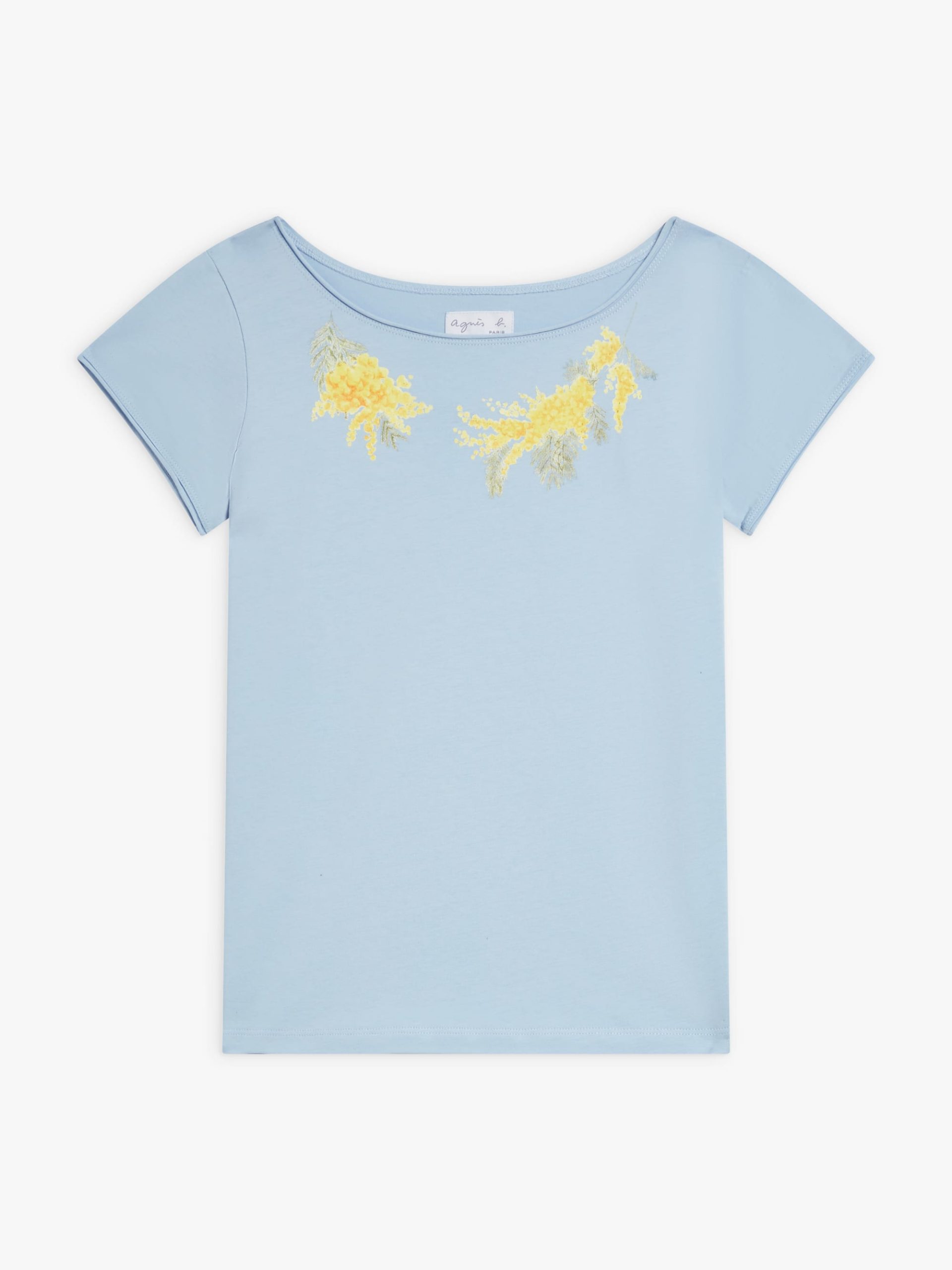 This soft cotton tee features an exclusive screen print by French artist MA ZA SI, known for her poetic interpretations of nature. The delicate “Mimosa” motif graces the neckline, bringing a fresh, floral touch to this simple yet refined silhouette.