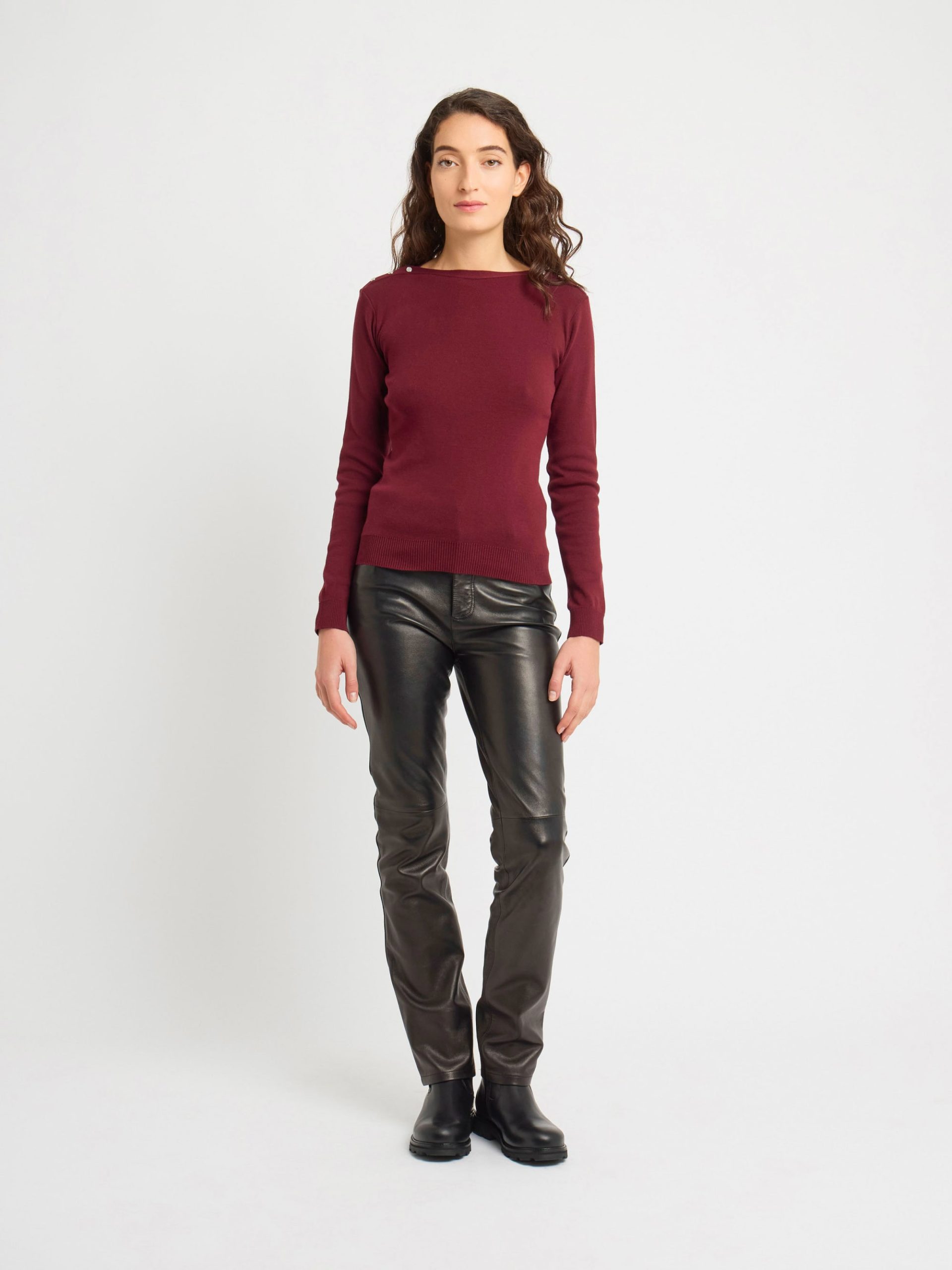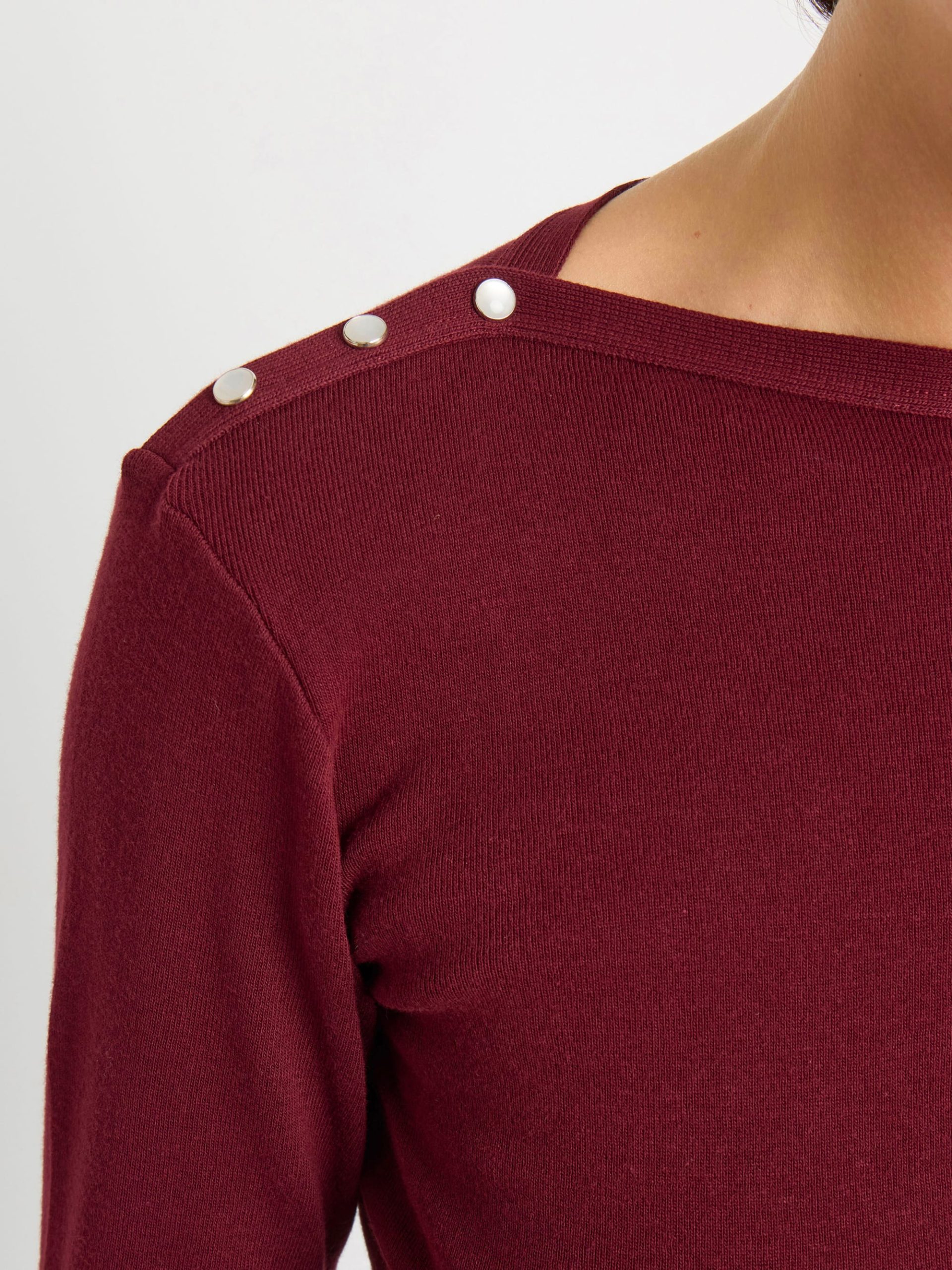 – Boat neckline- Long sleeves- Pearl silver-tone snap buttons- Made in France
