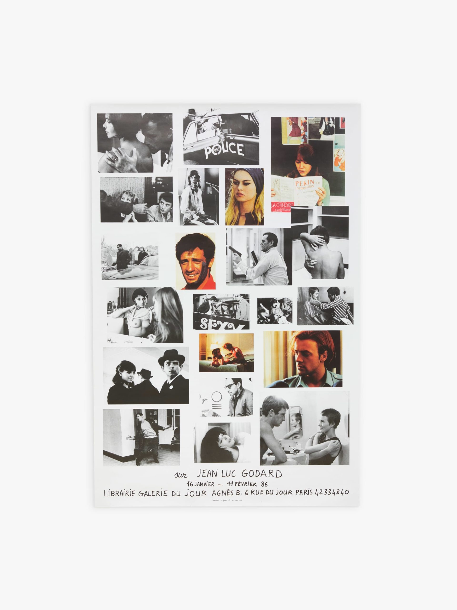 Created in 1986 at the Galerie du Jour in Paris, this poster features some of most iconic images from the films of director Jean Luc Godard. 31.5 x 47 inches