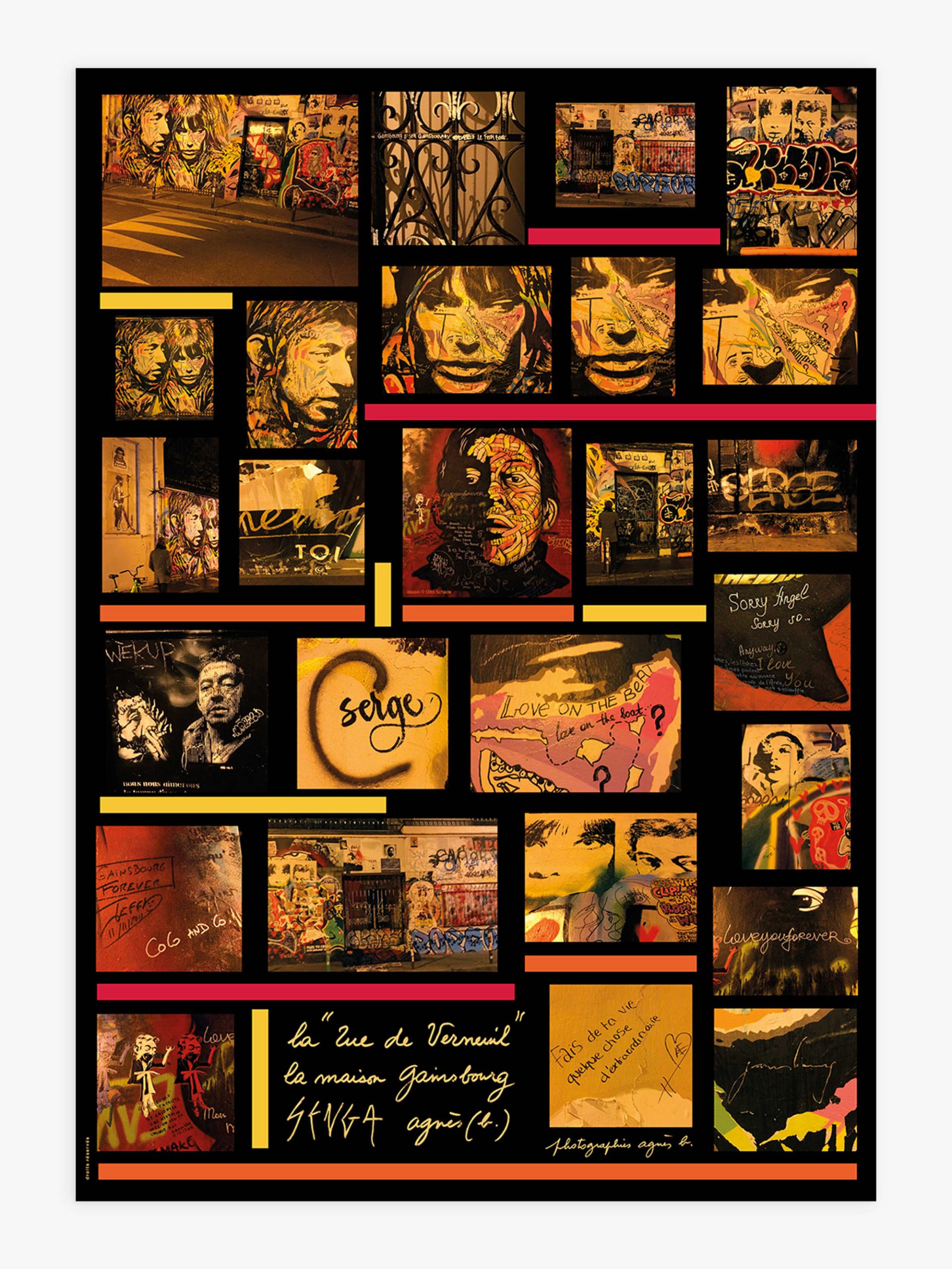 This poster reproduces a collage made by agnès b. from photos she took at night in Rue de Verneuil in Paris, near the last residence of Serge Gainsbourg. The walls of this street are covered with graffiti, paying tribute to Serge Gainsbourg. agnès b. wished to immortalize them with this collage.