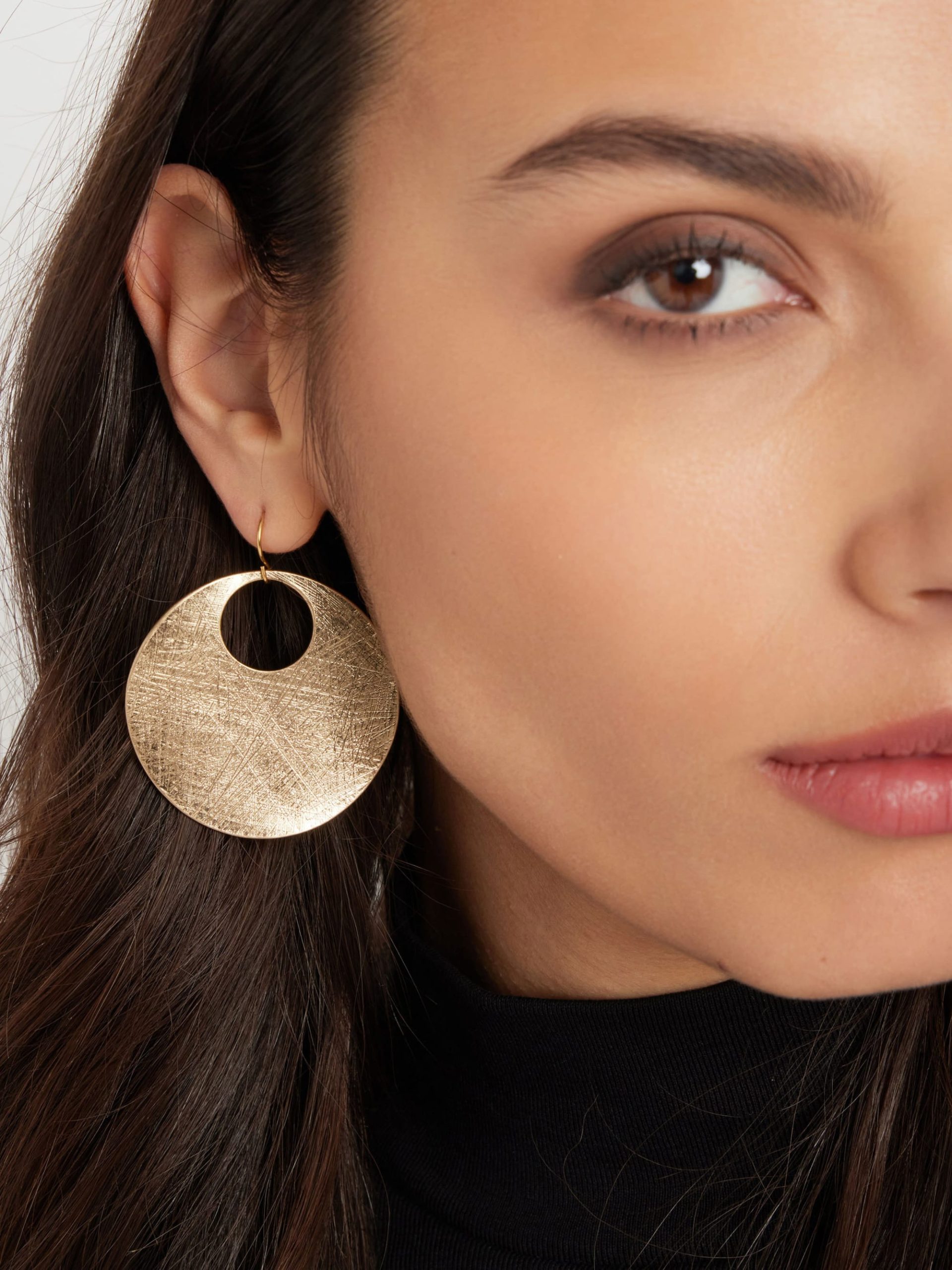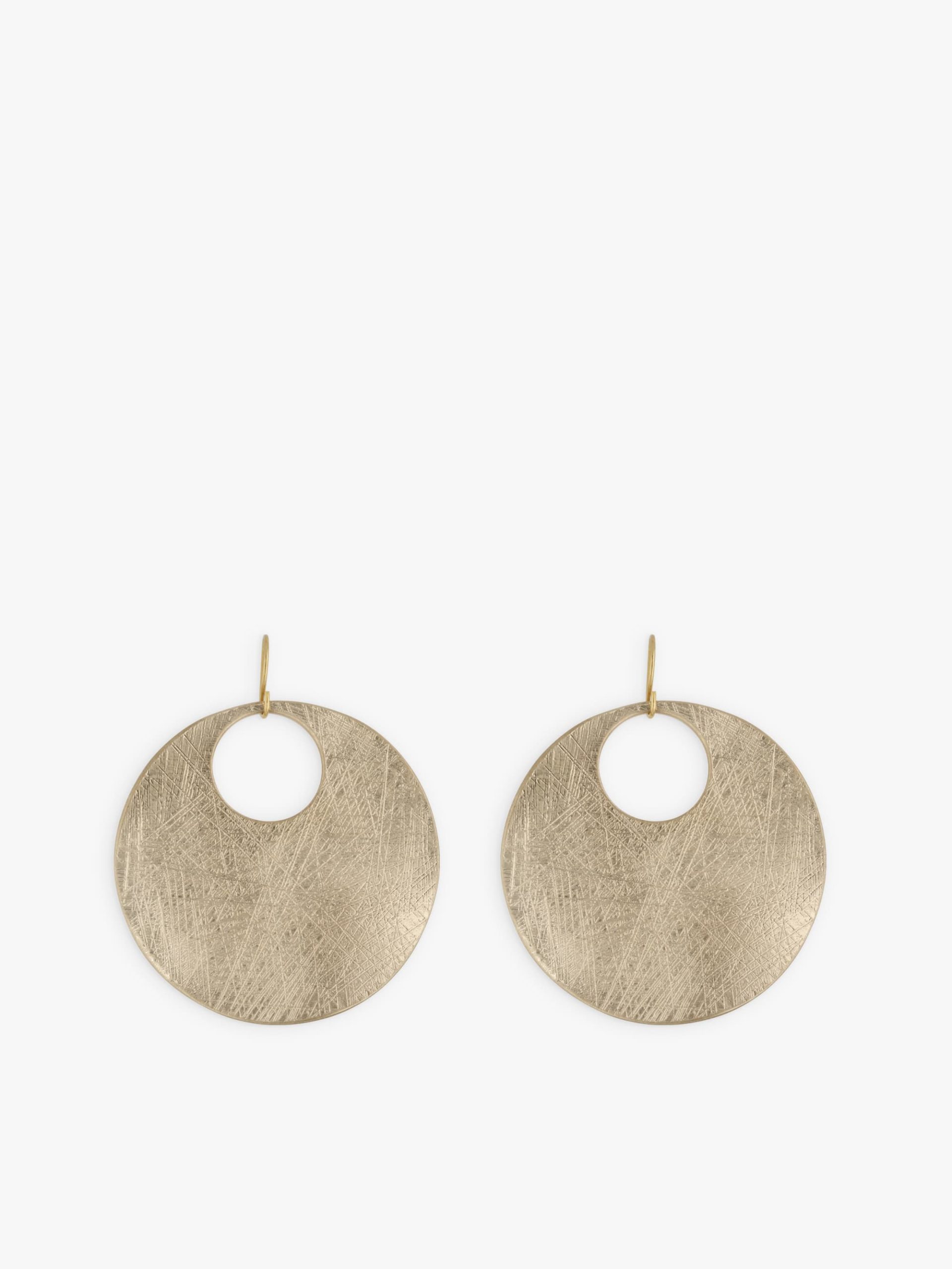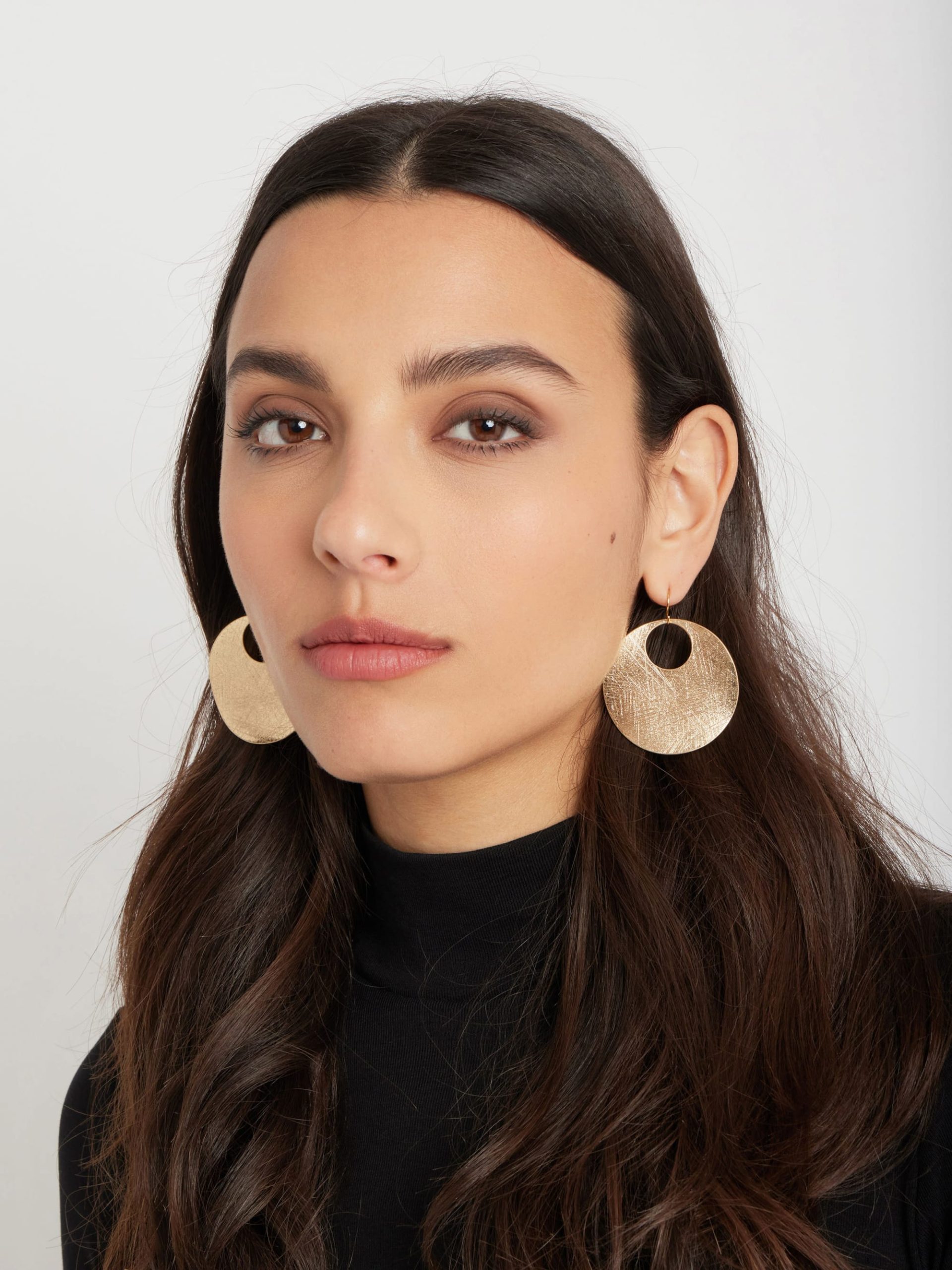 The Lotus earrings feature bold, circular medallions with a distinctive scratched texture, adding depth and character to their minimalist design.