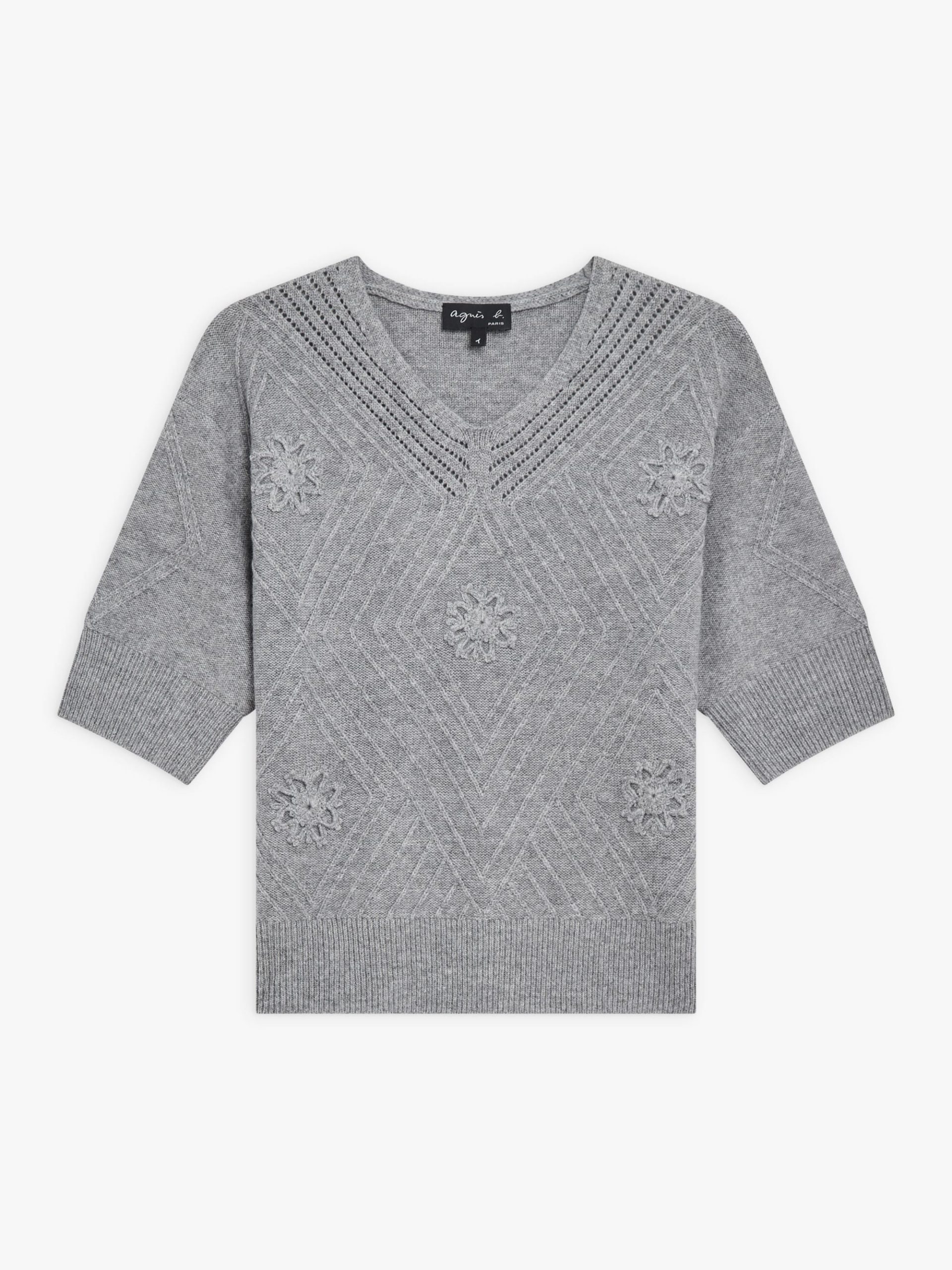 – V neckline- Elbow-length sleeves- flower motif on the front with a crochet motif