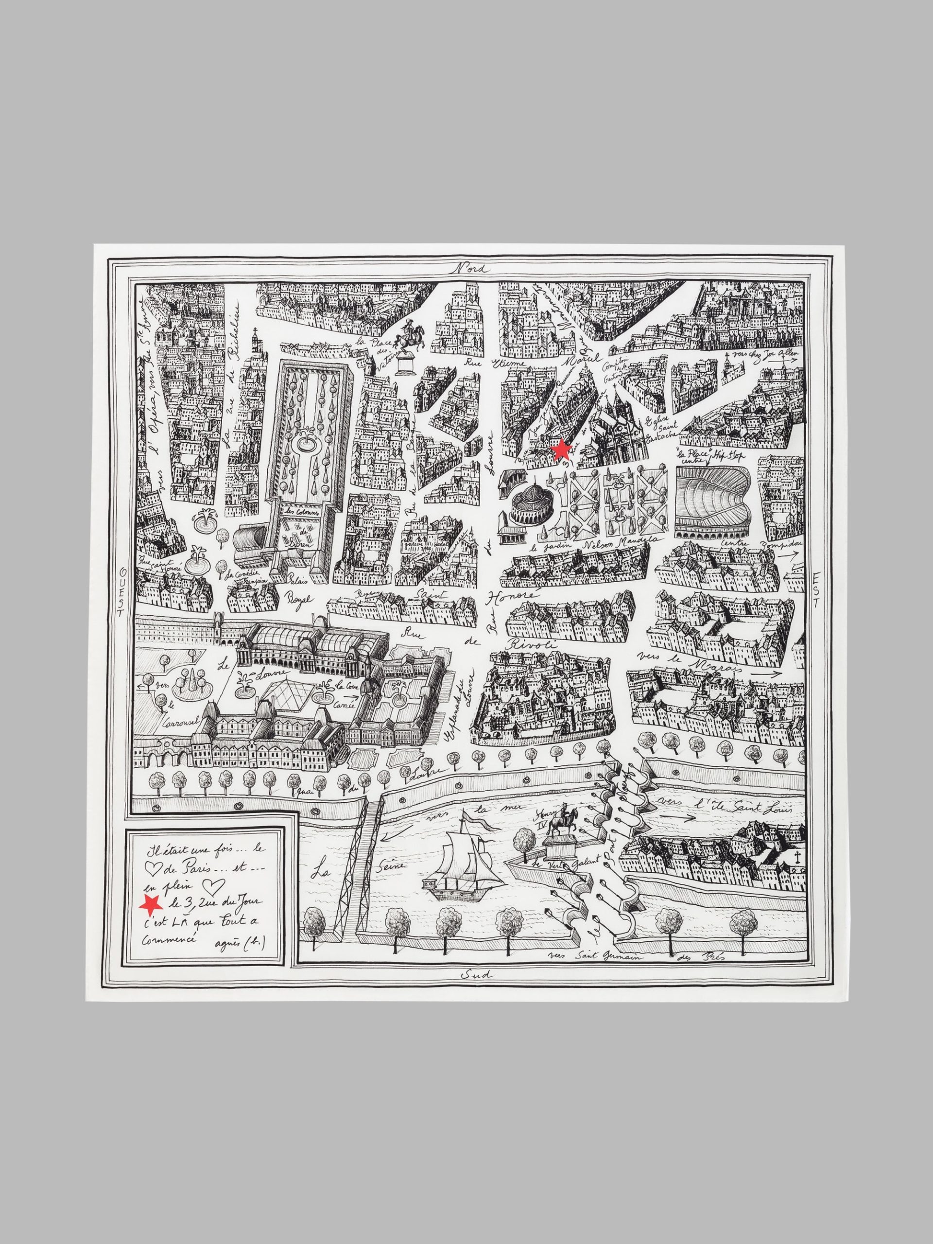 In addition to the map, the scarf features a handwritten message from agnès b., adding a personal touch:
