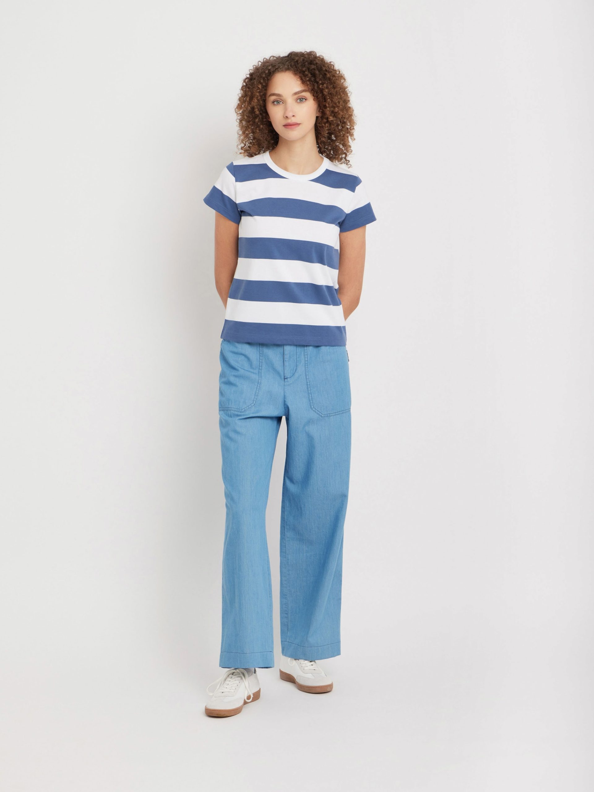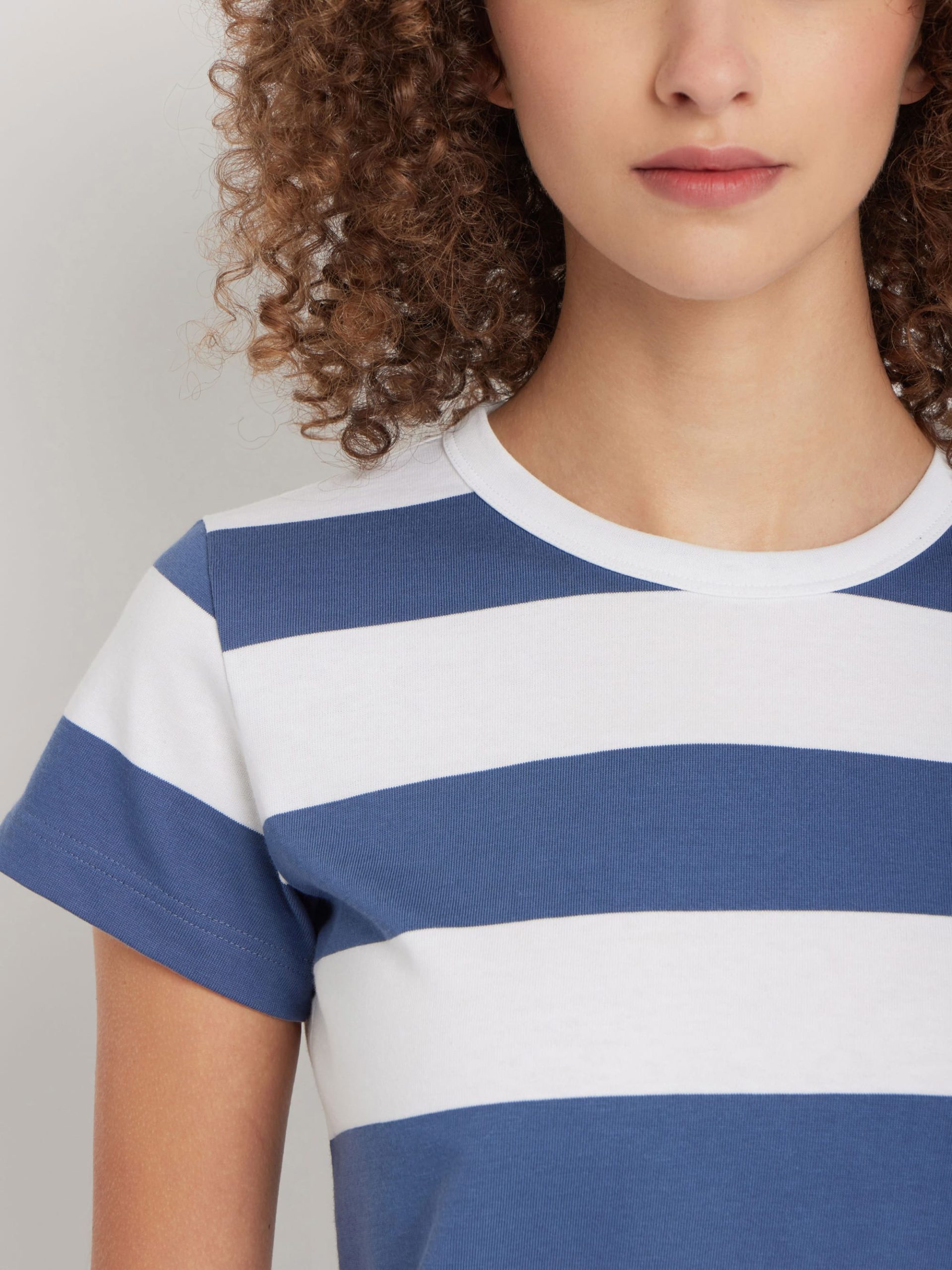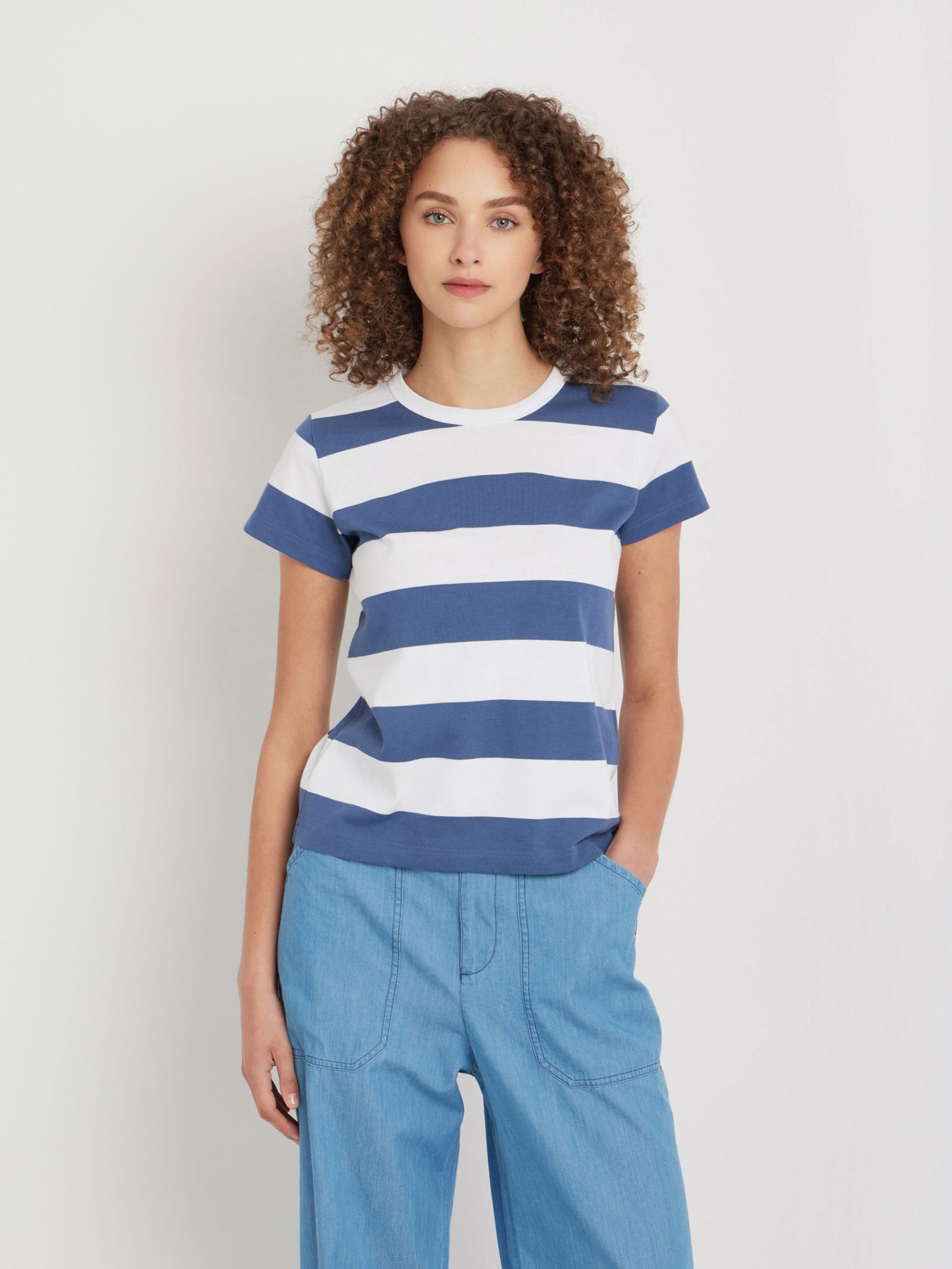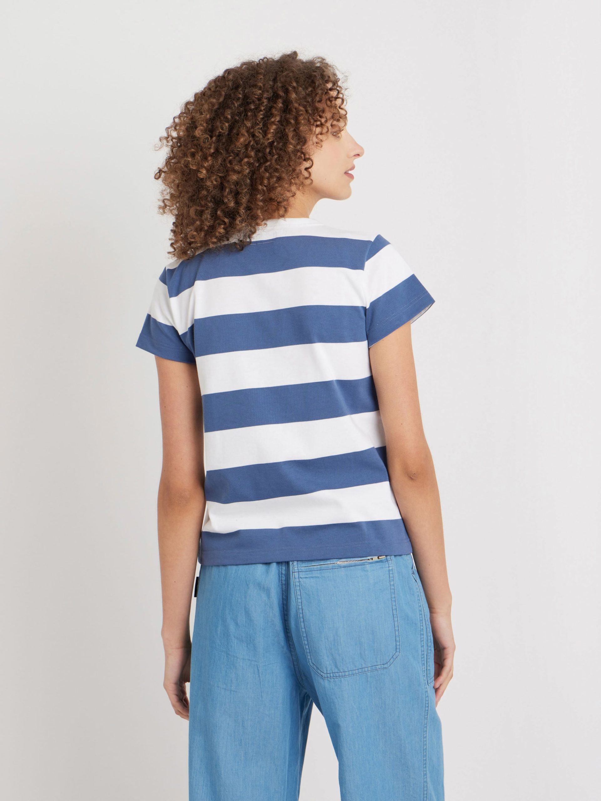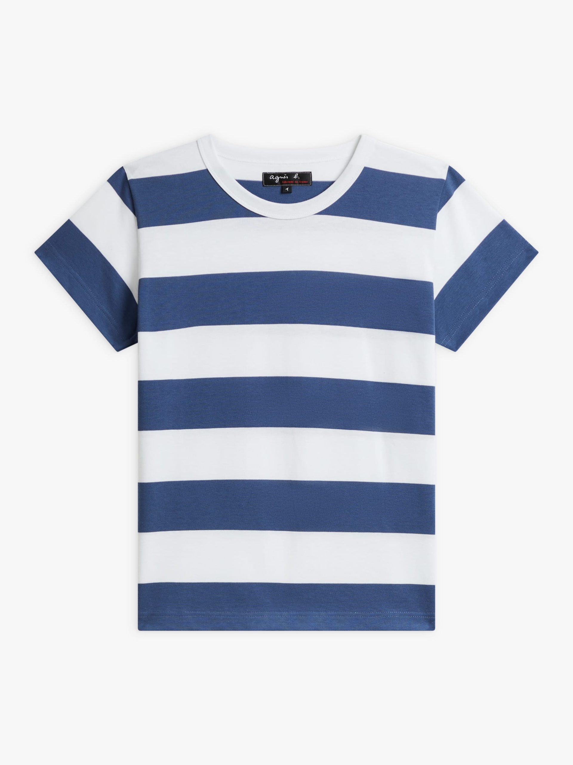 A classic striped T-shirt with a bold 60 x 60mm stripe pattern.This design originated in 1977 when agnès b. collaborated with a rugby shirt manufacturer to create a collarless T-shirt with the same durable, structured cotton. The result is an iconic piece that retains its shape, even after repeated washes.