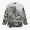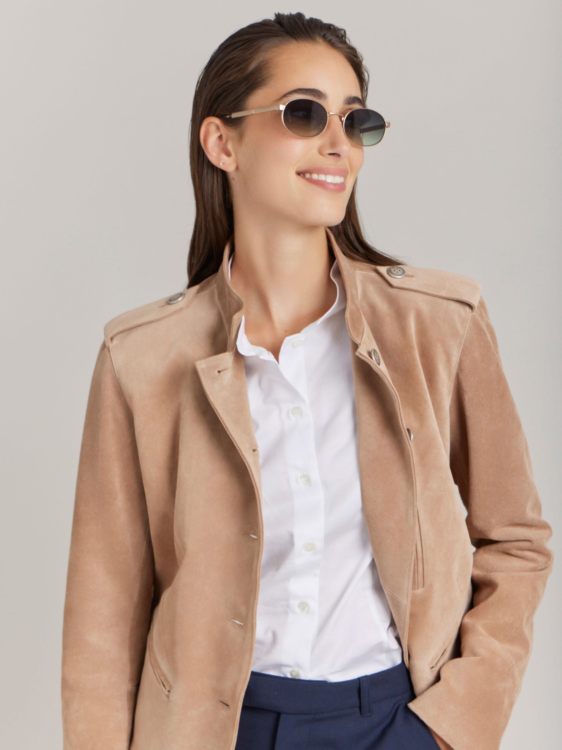 Made in France, this cotton serge shirt features an elegant stand collar and a minimalist design with subtle tailoring at the waist. Its refined cut makes it a versatile piece.
