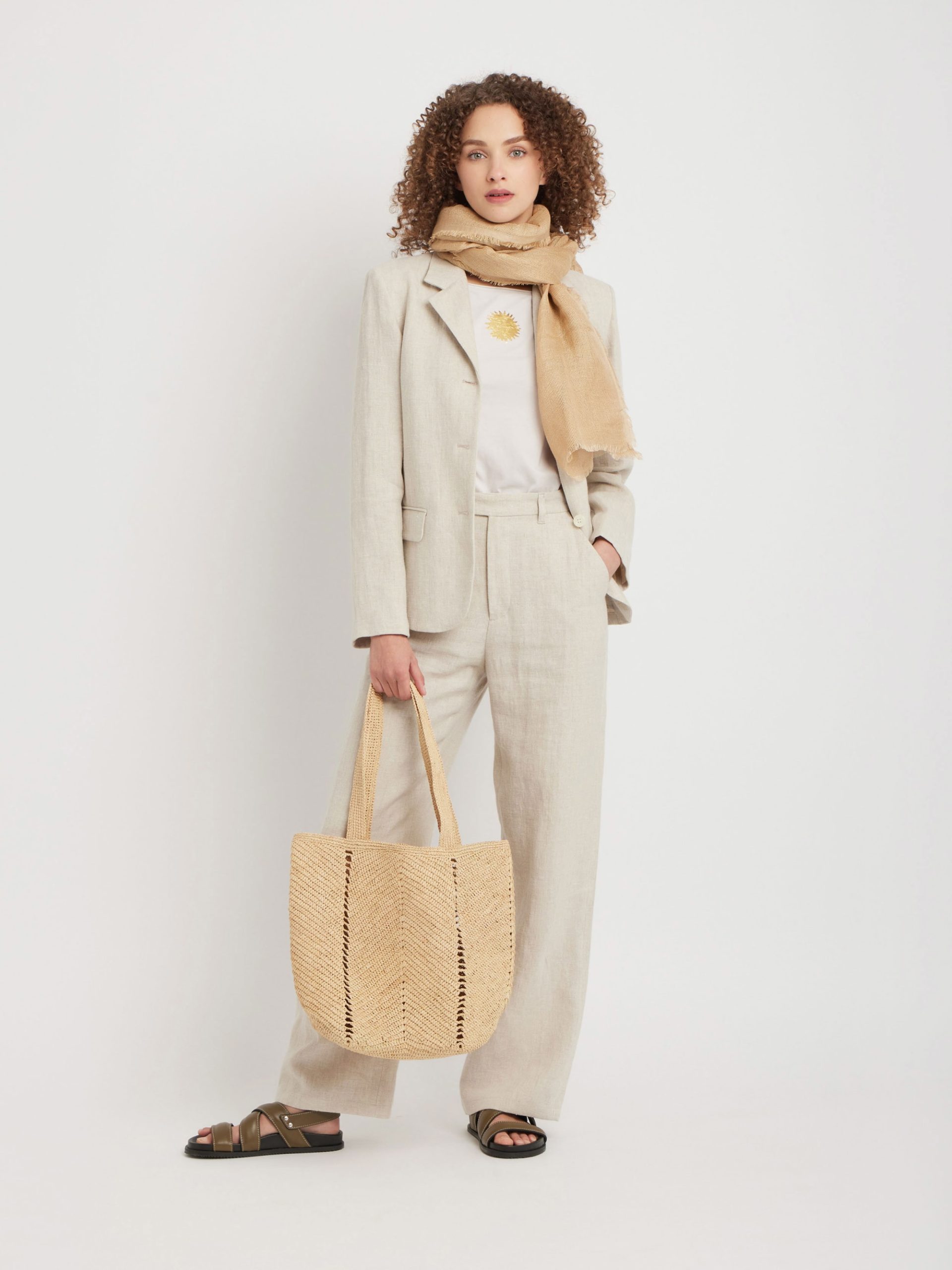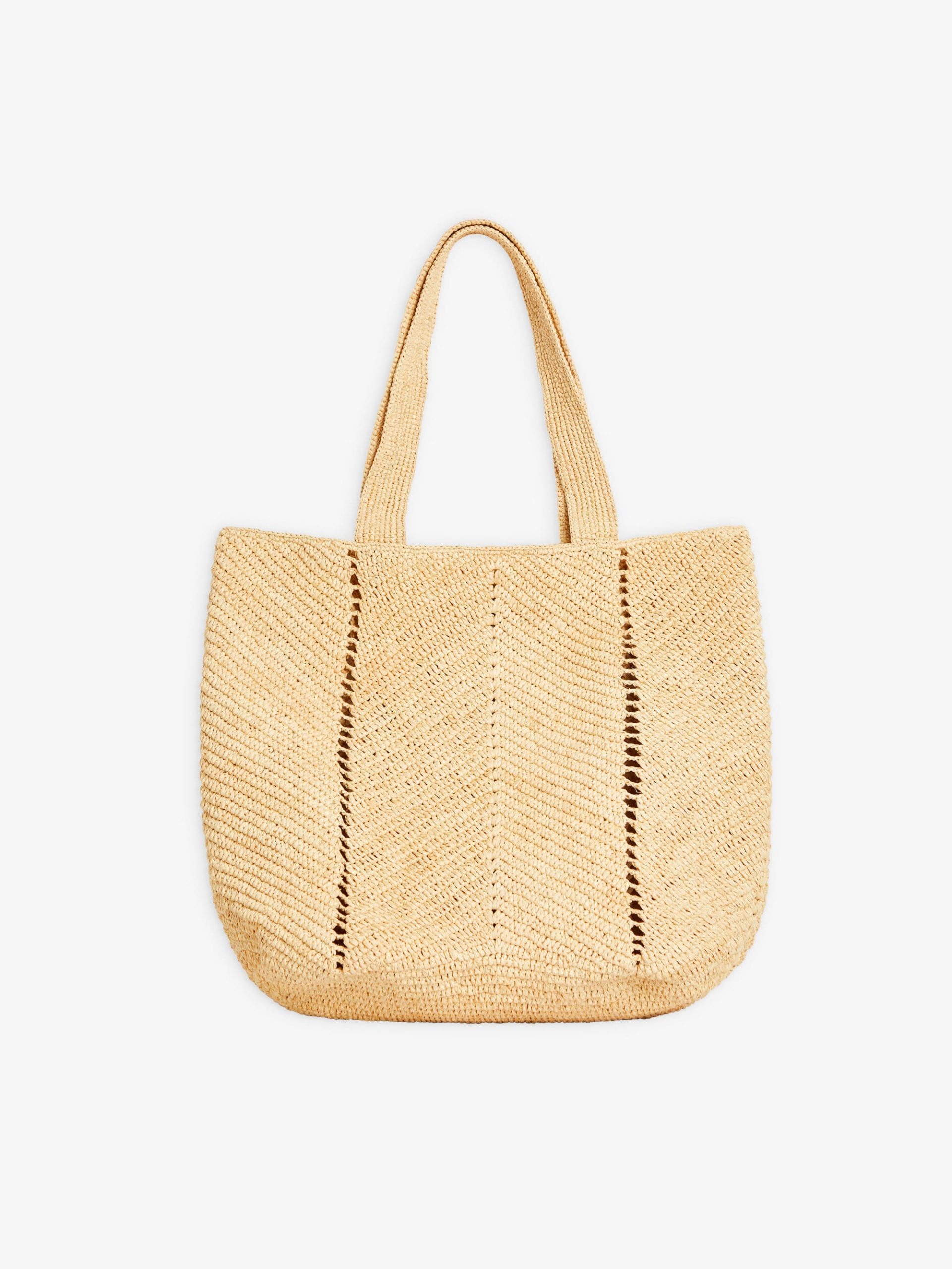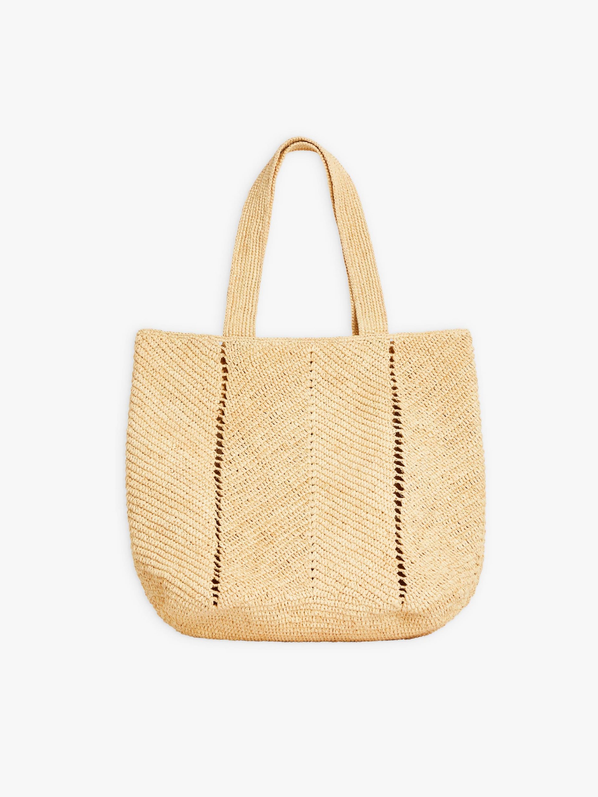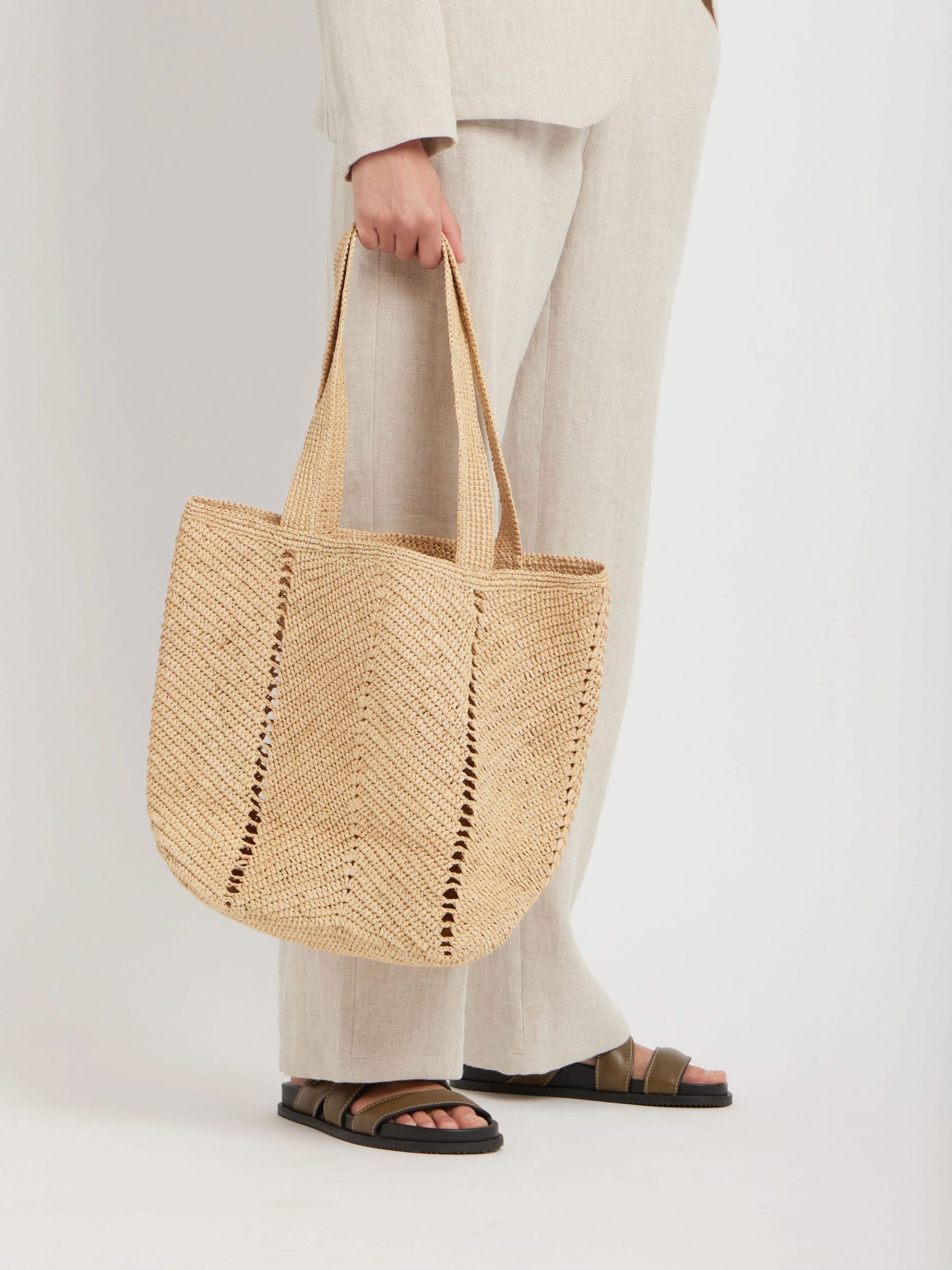 The Leila bag is handwoven from natural raffia, featuring an elegant weave and a softly structured shape. Its unlined design keeps it lightweight.