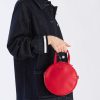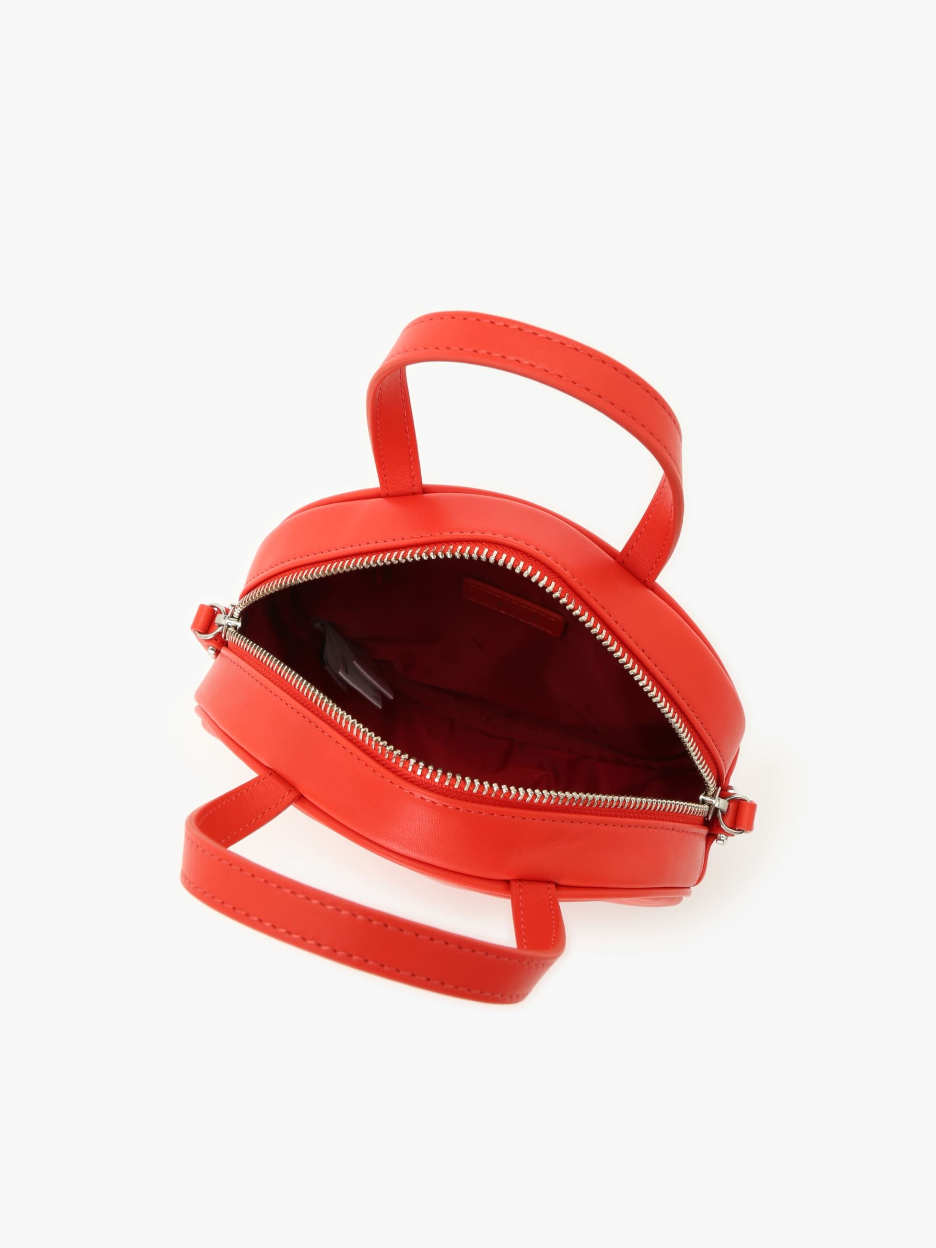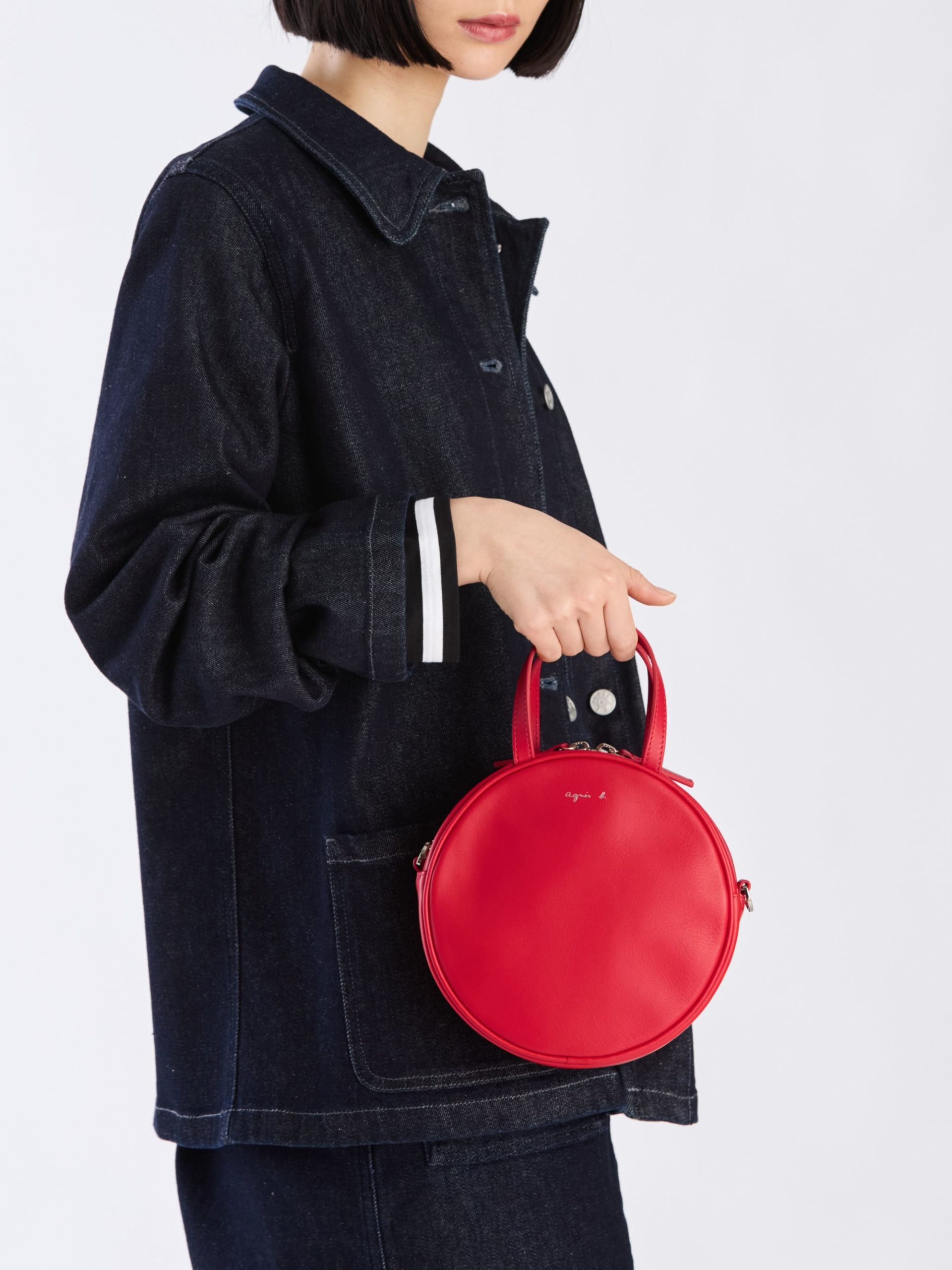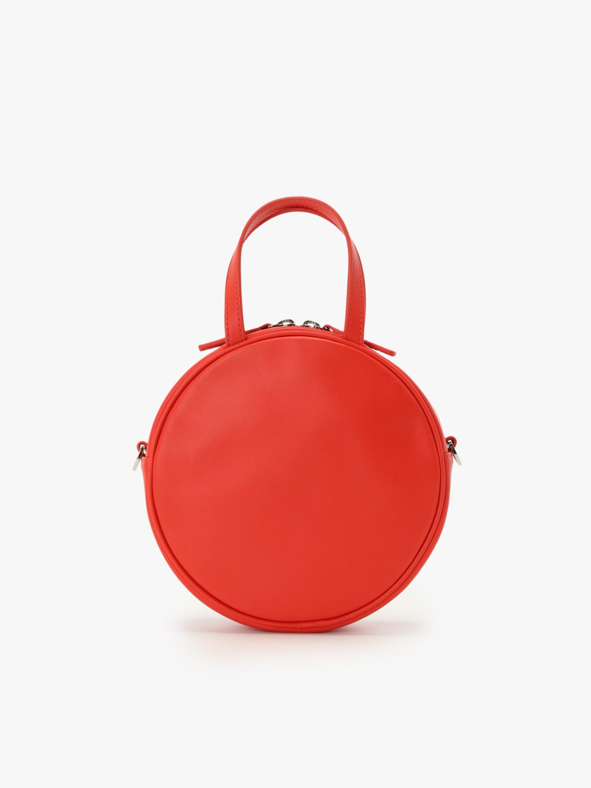 This handbag showcases a distinctive round shape that adds a unique touch to any outfit.Crafted for elegance, it includes a long shoulder strap for two carrying options. The glossy leather texture adds sophistication, making it a standout accessory.