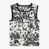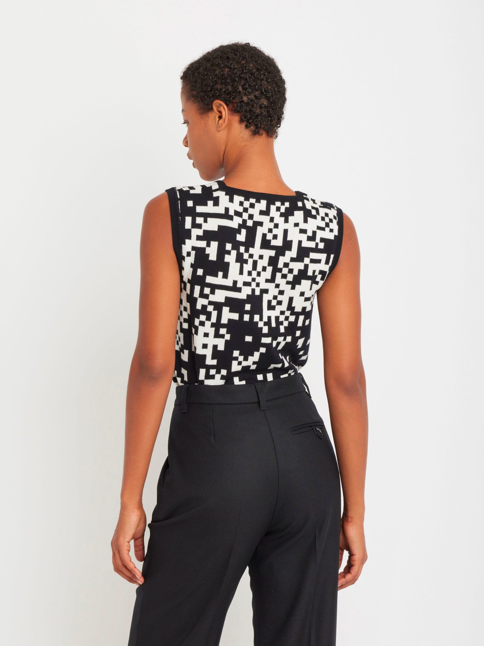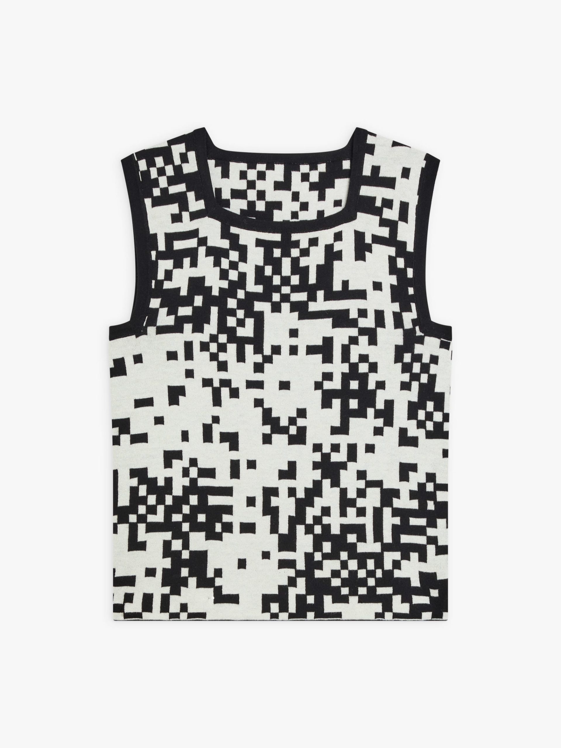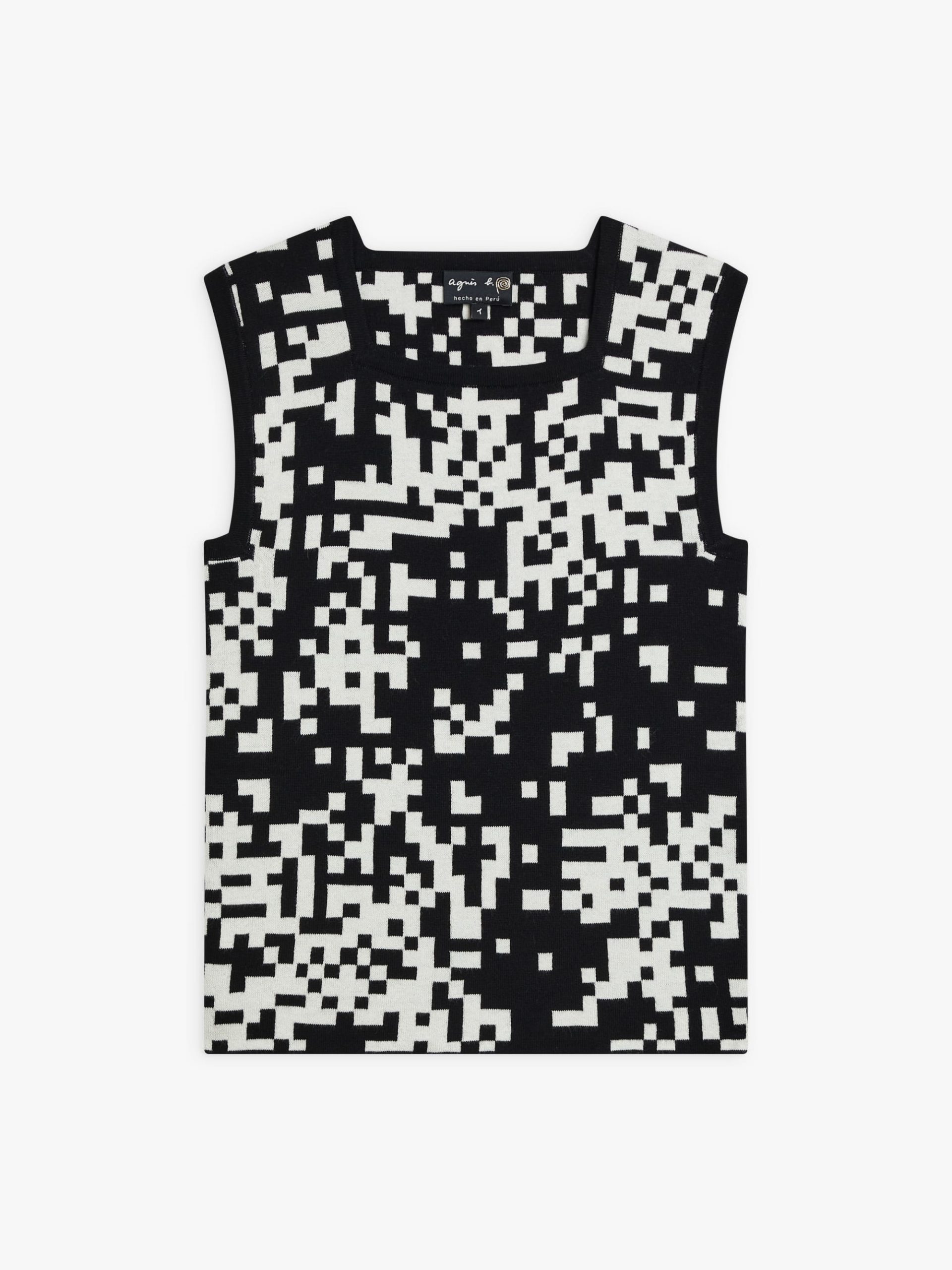 The Pixel sleeveless sweater features a bold black-and-white pixel motif in jacquard, a signature of agnès b. Its square neckline and graphic pattern create a unique, standout look.