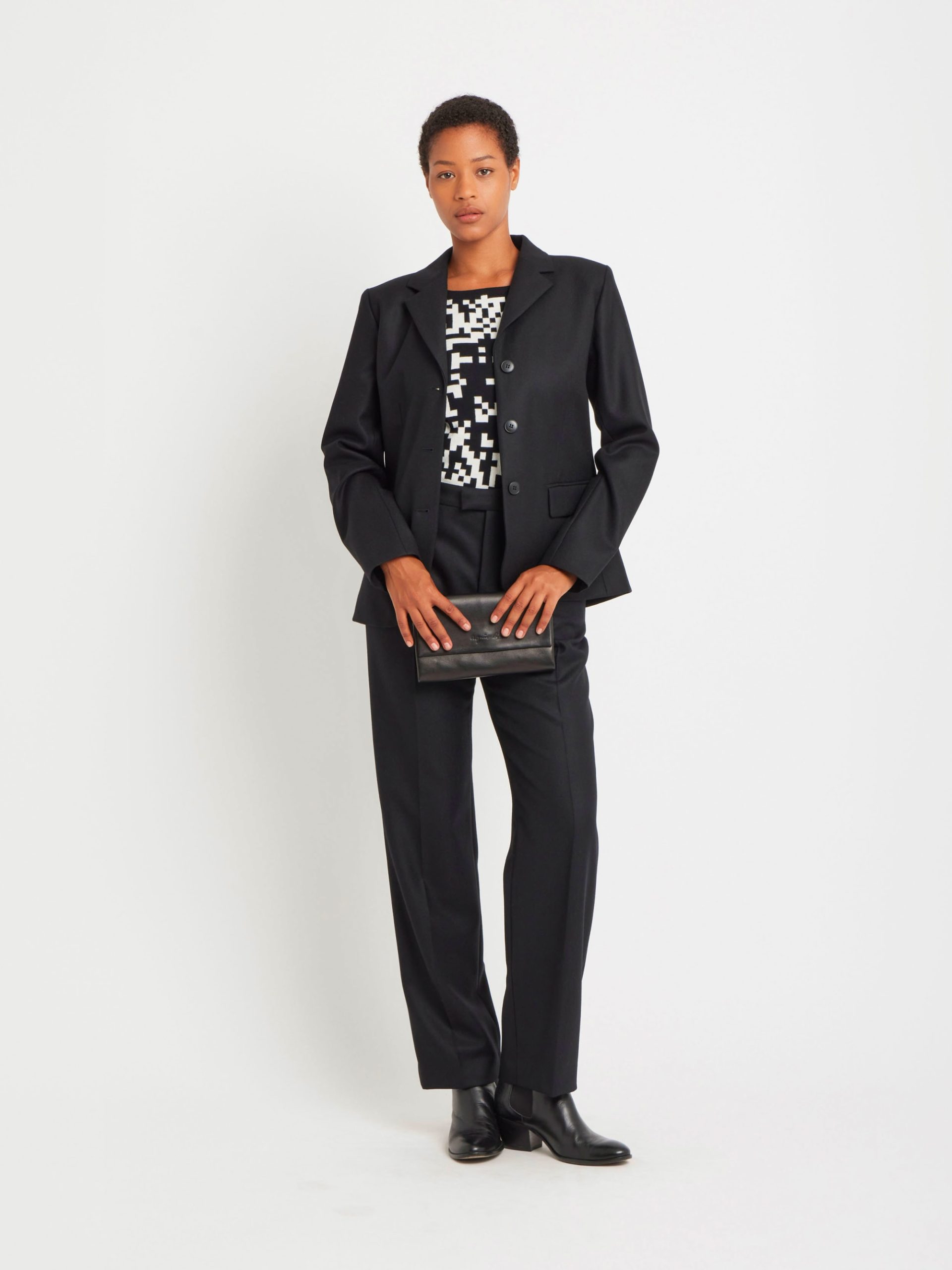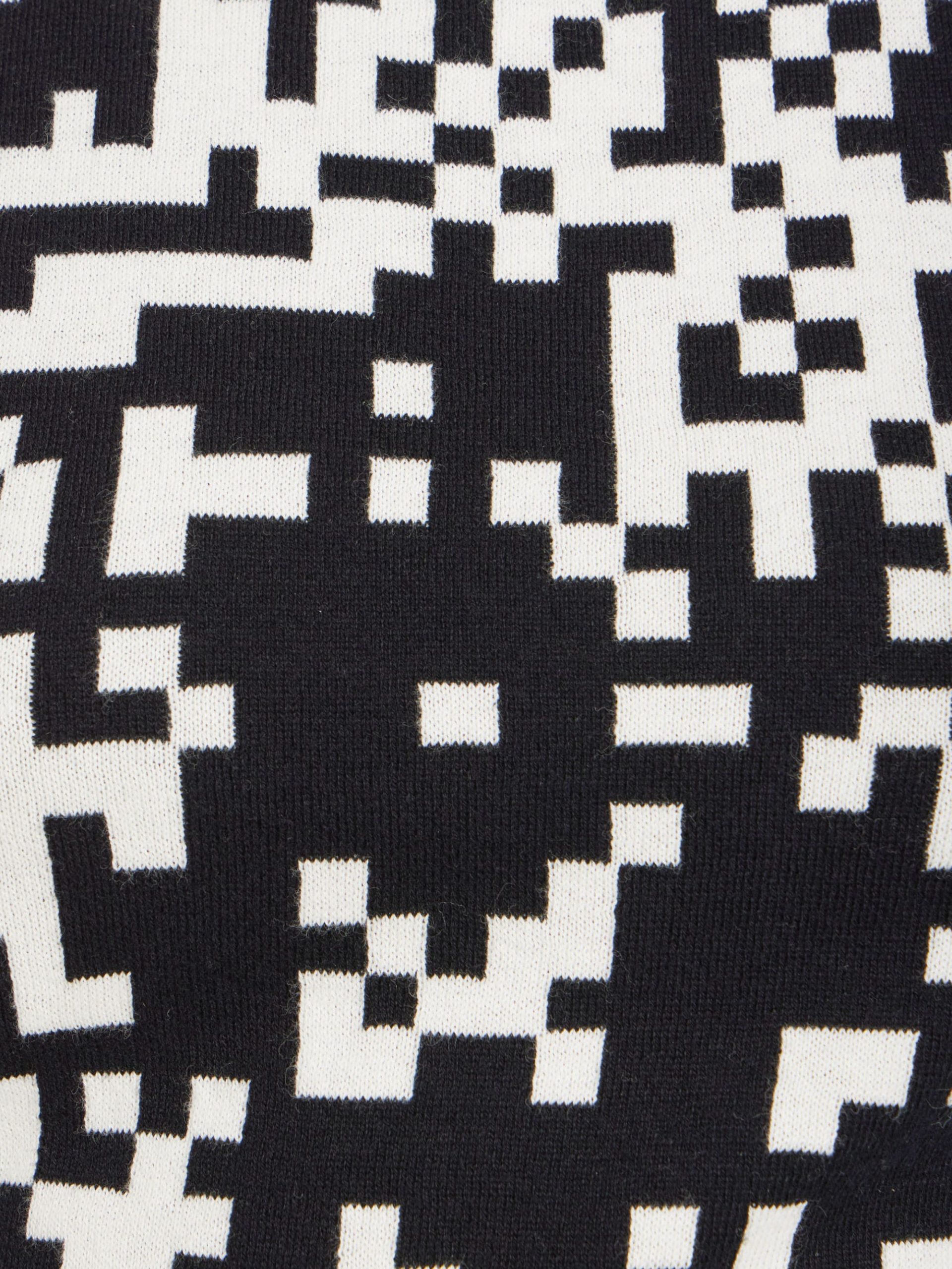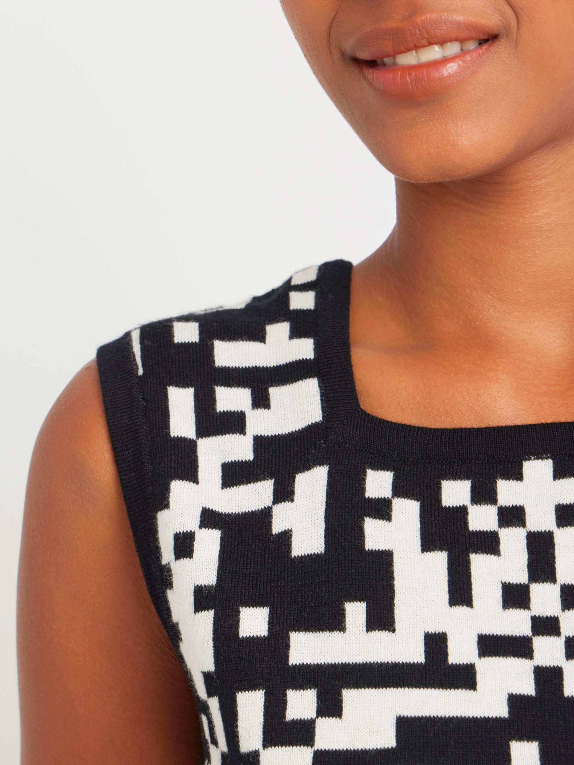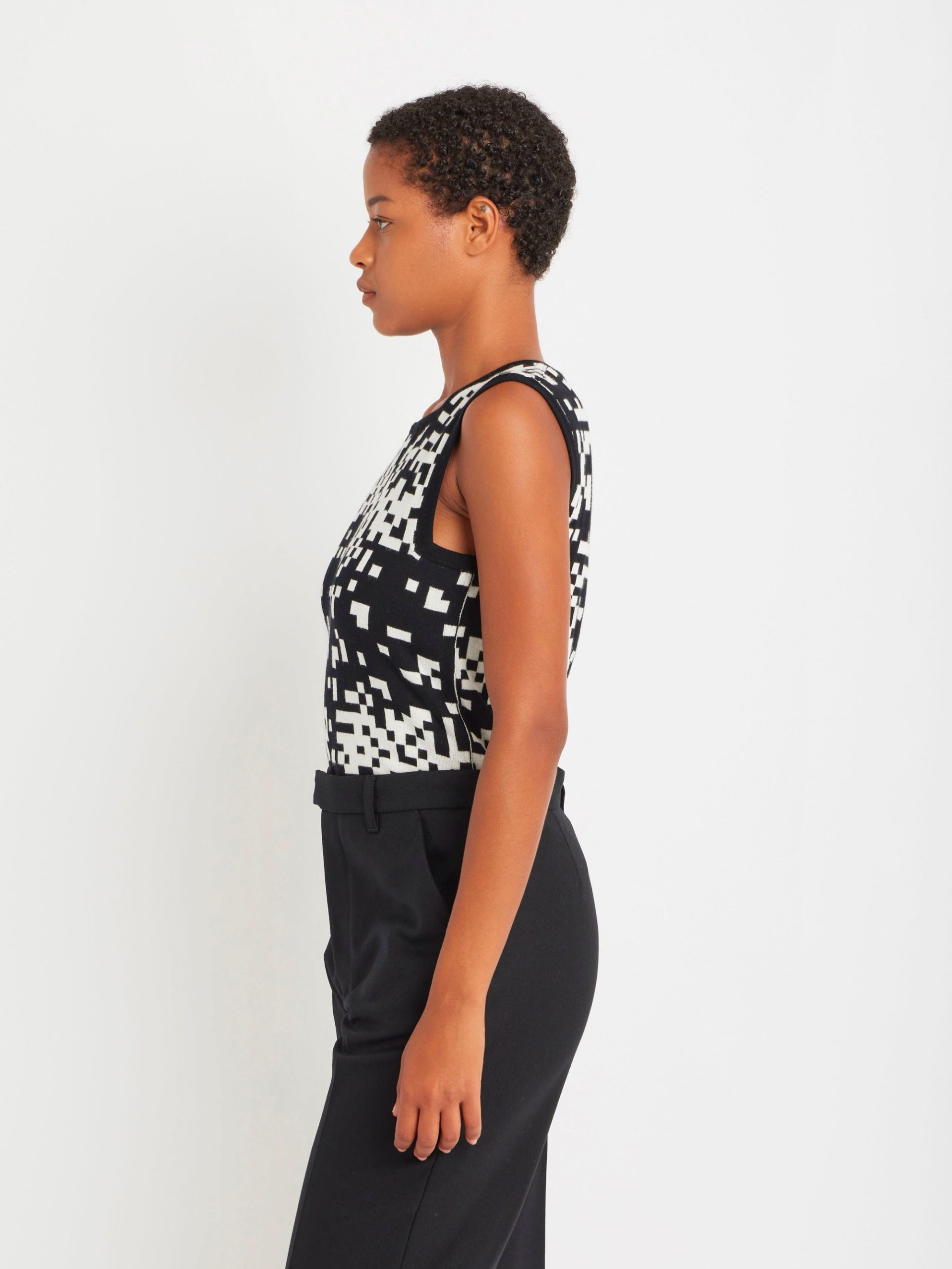 The Pixel sleeveless sweater features a bold black-and-white pixel motif in jacquard, a signature of agnès b. Its square neckline and graphic pattern create a unique, standout look.